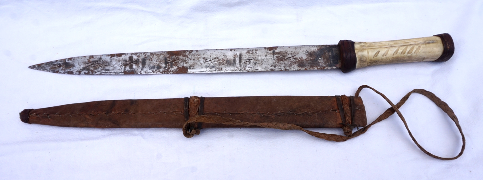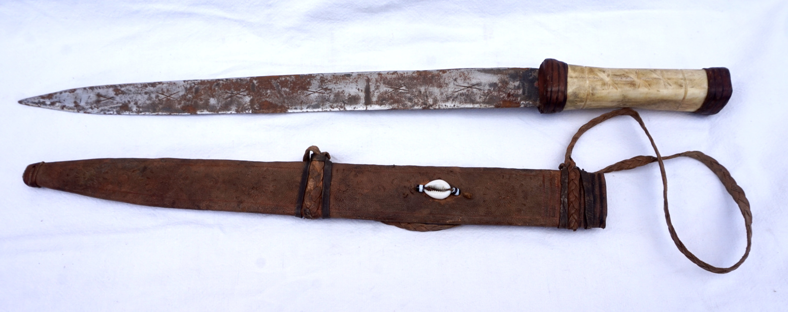 Grand poignard dague touareg Afrique du Nord-Ouest, manche os de mehari, fourreau cuir poinçonné, orné d'un cauri. Longueur totale 62.8 cm, poids 544 gr.