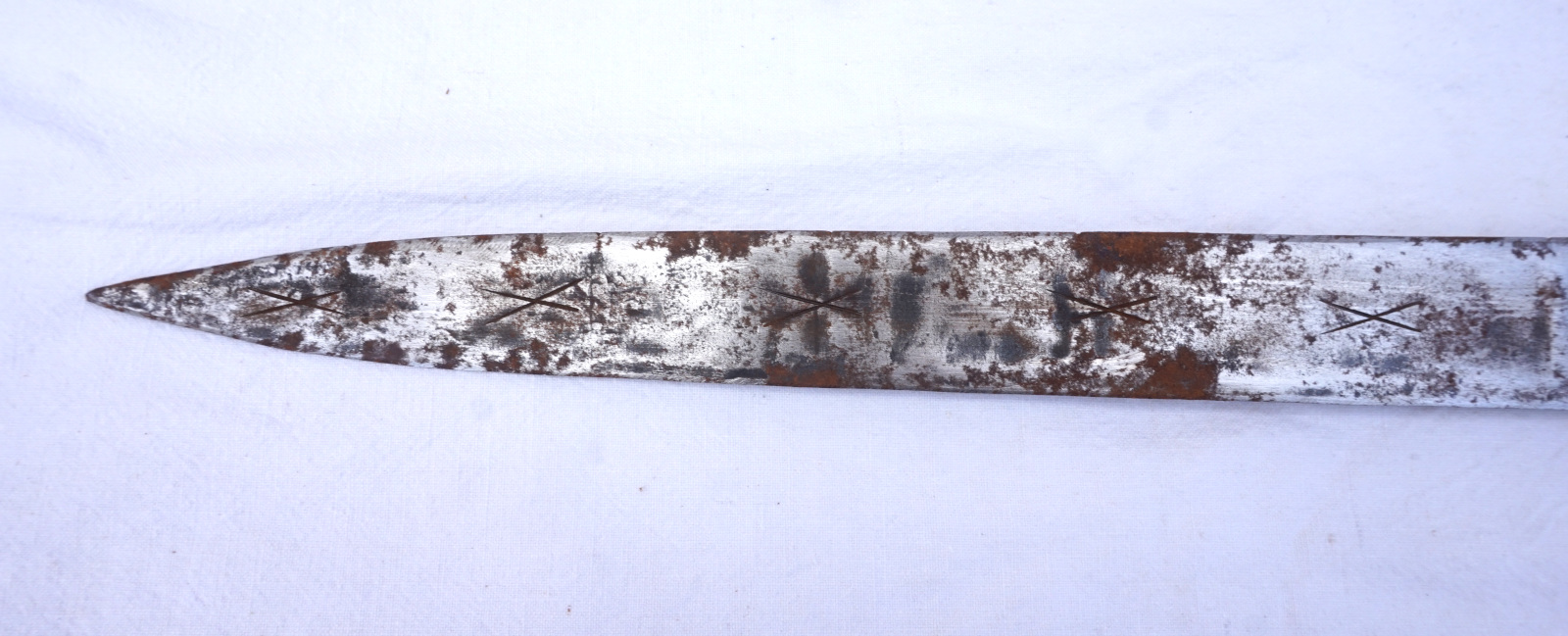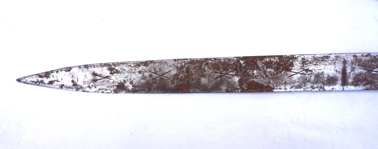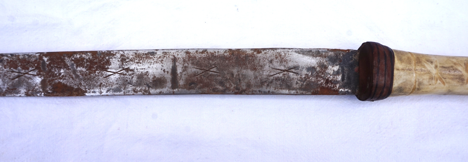 African touareg large dagger with engraved blade, leather scabbard zenhanced with cowrie and ox handle. 24 3/4" (62.8cm) length, weight 1lb 3oz (544 grams). Good condition.