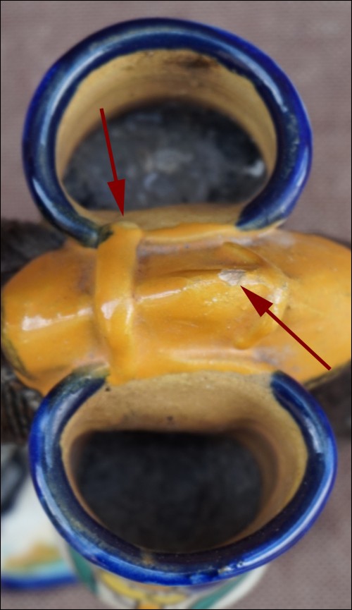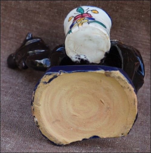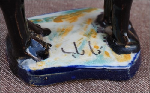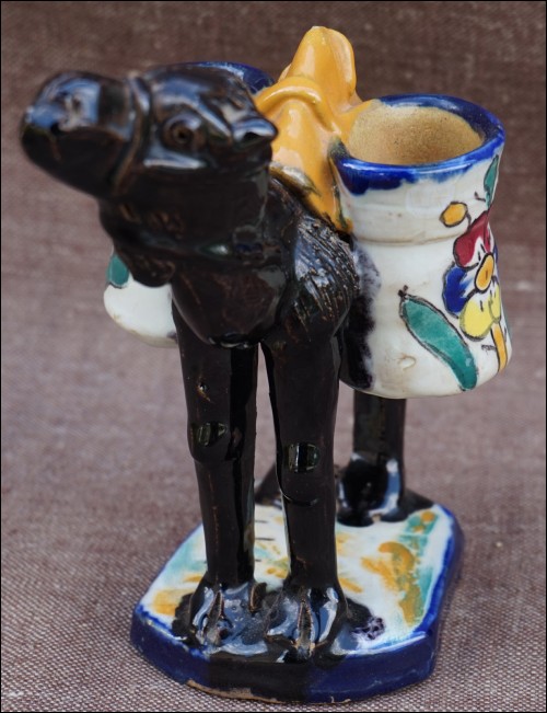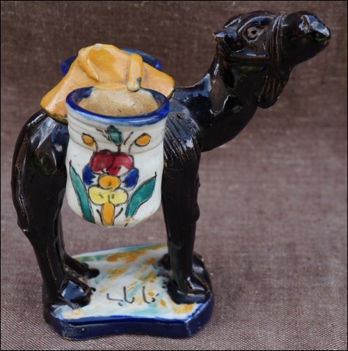 Art Deco camel or dromadery with 2 vases ceramic statue made by Louis Tissier in Nabeul Tunisia during the 1930's. It's signed on the base. 5 1/2" height 5 1/8" length 3 1/2" width. Good condition a few tiny glaze shortages as presented on the following pictures.