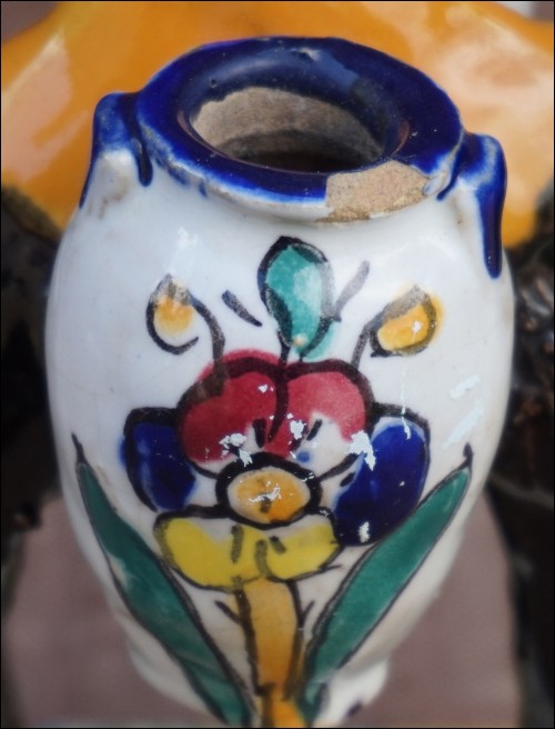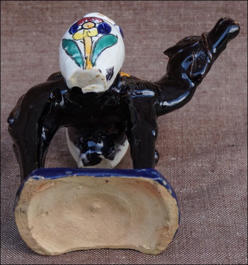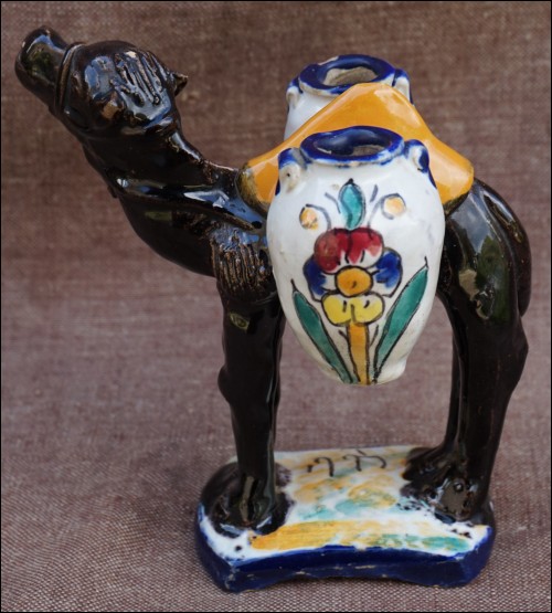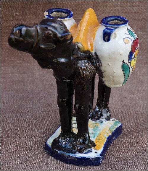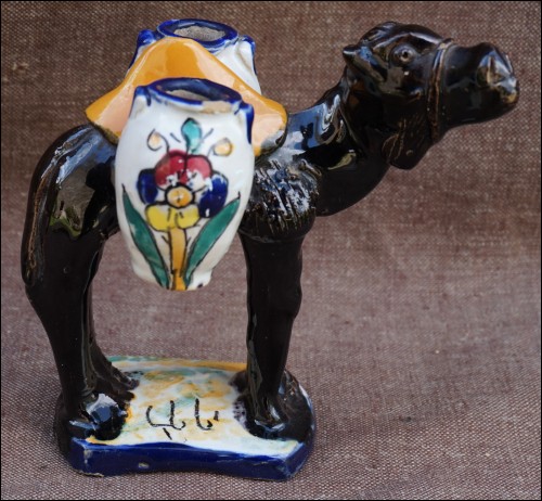 Dromadaire ou chameau charger de paniers, poterie Louis Tissier à Nabel (Tunisie) vers 1930. Faïence polychrome vernissée aux paniers fleuris, inscription en lettres cursives sur le socle : Nabeul. Il a servi de bougoir, bel état, saut d'émail. Hauteur 15 cm, longueur 13 cm, largeur 9 cm.
