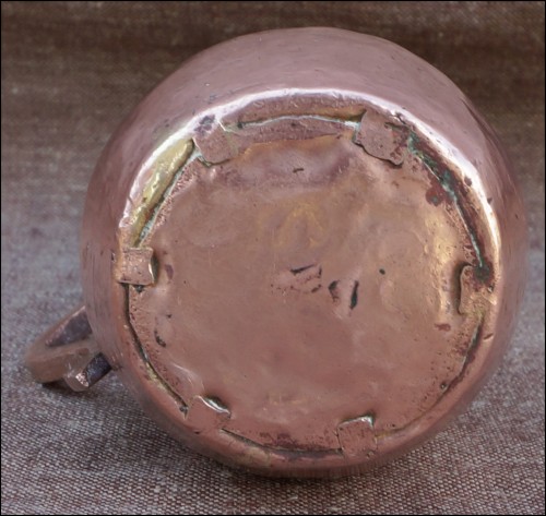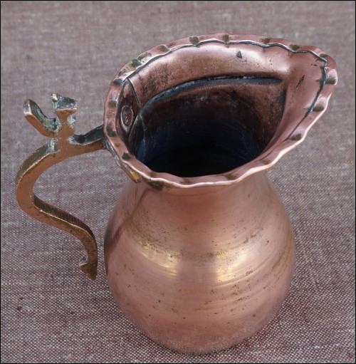 Pichet iranien en cuivre avec anse bronze découpé ornée d'un coq de style Seljuk, travail perse période ottoman XVII-XVIIIème siècle. Hauteur 14,4 cm.