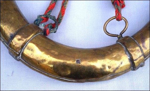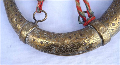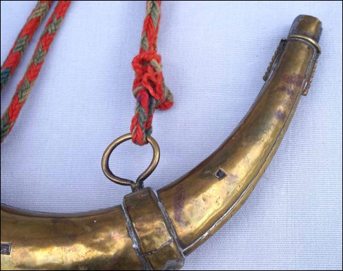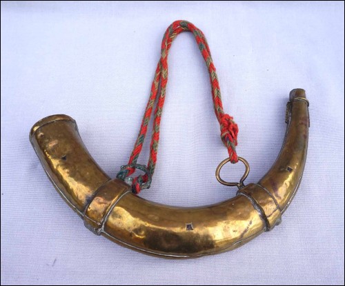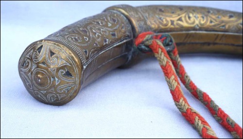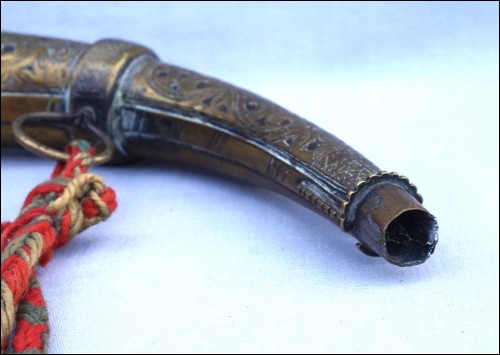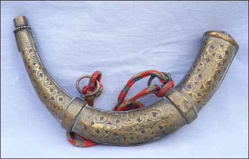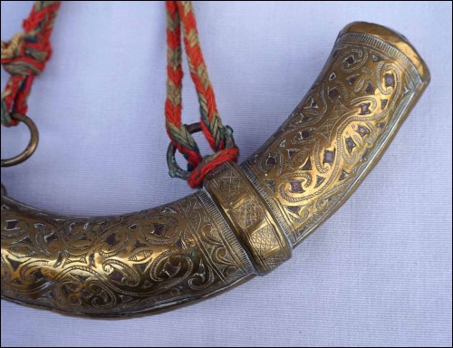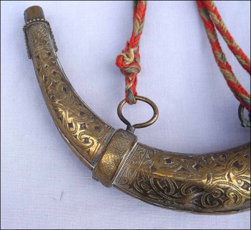 French protectorate in Morocco powder horn in horn covered with engraved brass made during the 1920's. 12" (30.5cm) width, 6 7/8" (17.5cm) height. Beautiful condition as shown by the following pictures.