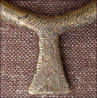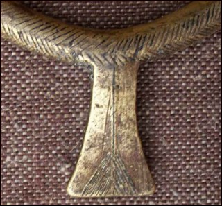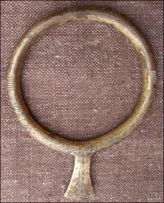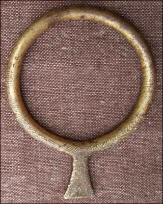 Bracelet de bras tribal, dit bracelet monnaie, à la fois poids et défense pour les femmes de l'ethnie Bassari (?), avant 1900. En forme d'anneau fermé à ergot en queue de poisson et finement ciselé d'arêtes, il parait en alliage de bronze fort en cuivre et recouvert d'or ou de bronze. Hauteur totale 11 cm, diamètre 8,5 cm.