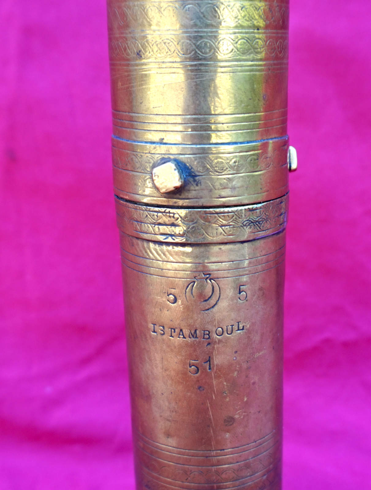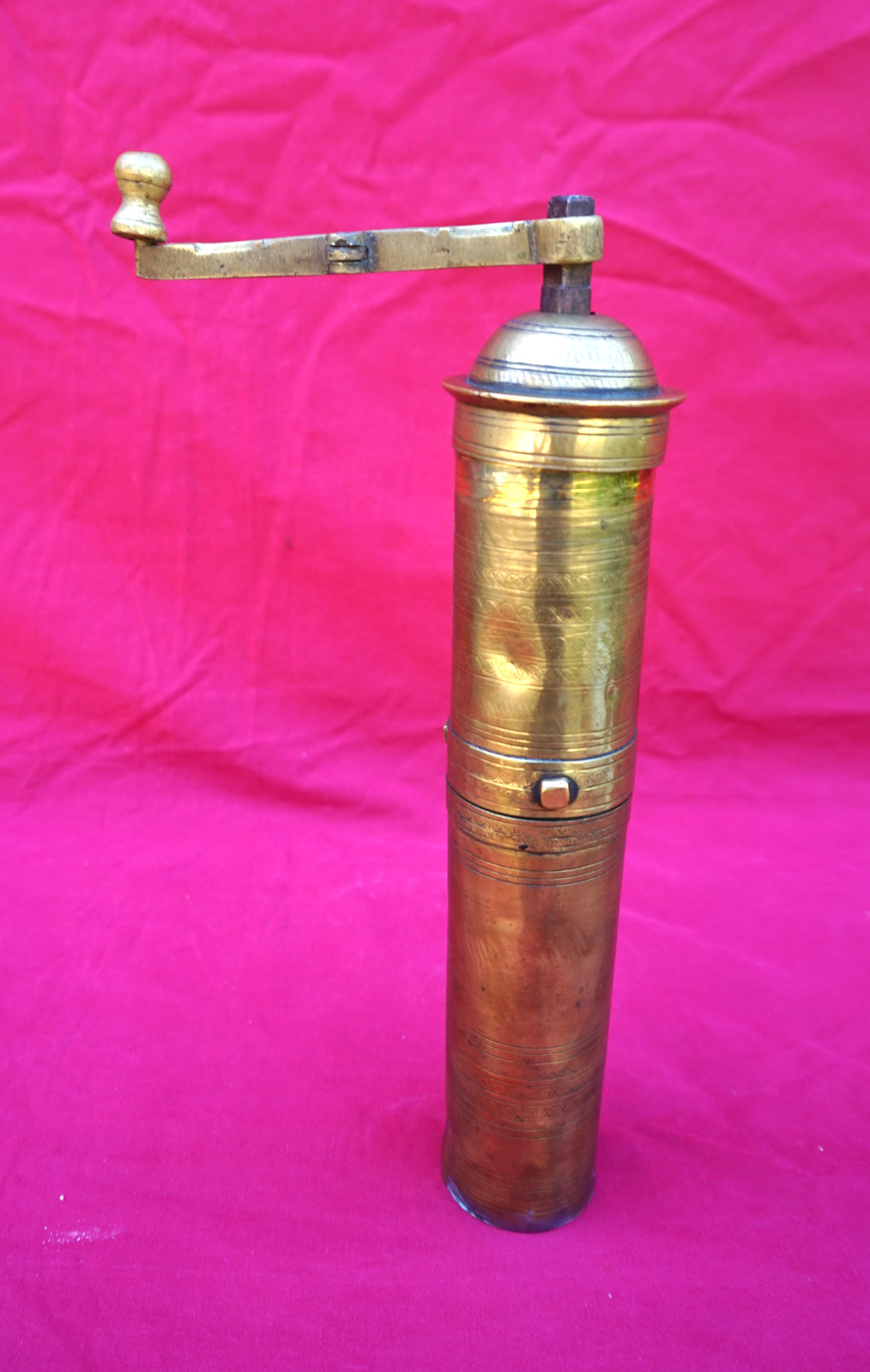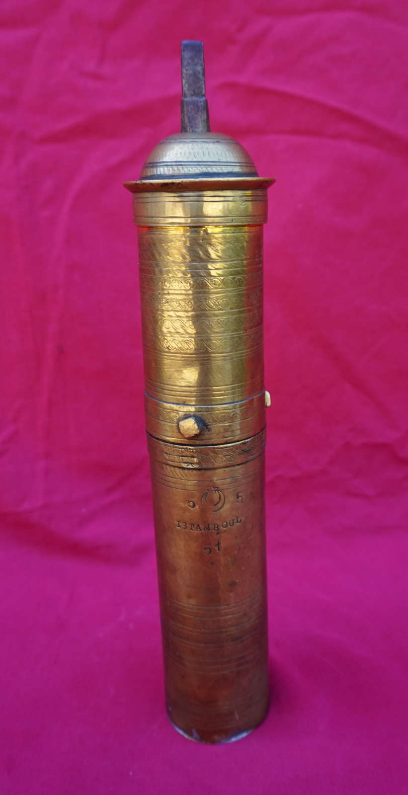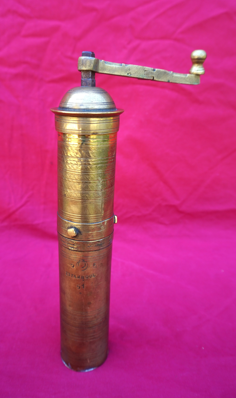 For our French-speaking friends Moulin à café turc en laiton ciselé gravé, Istambul et 5 croissant de lune 5, 51, vers 1900. Hauteur 29 cm, diamètre 6.3 cm. Bel état.
