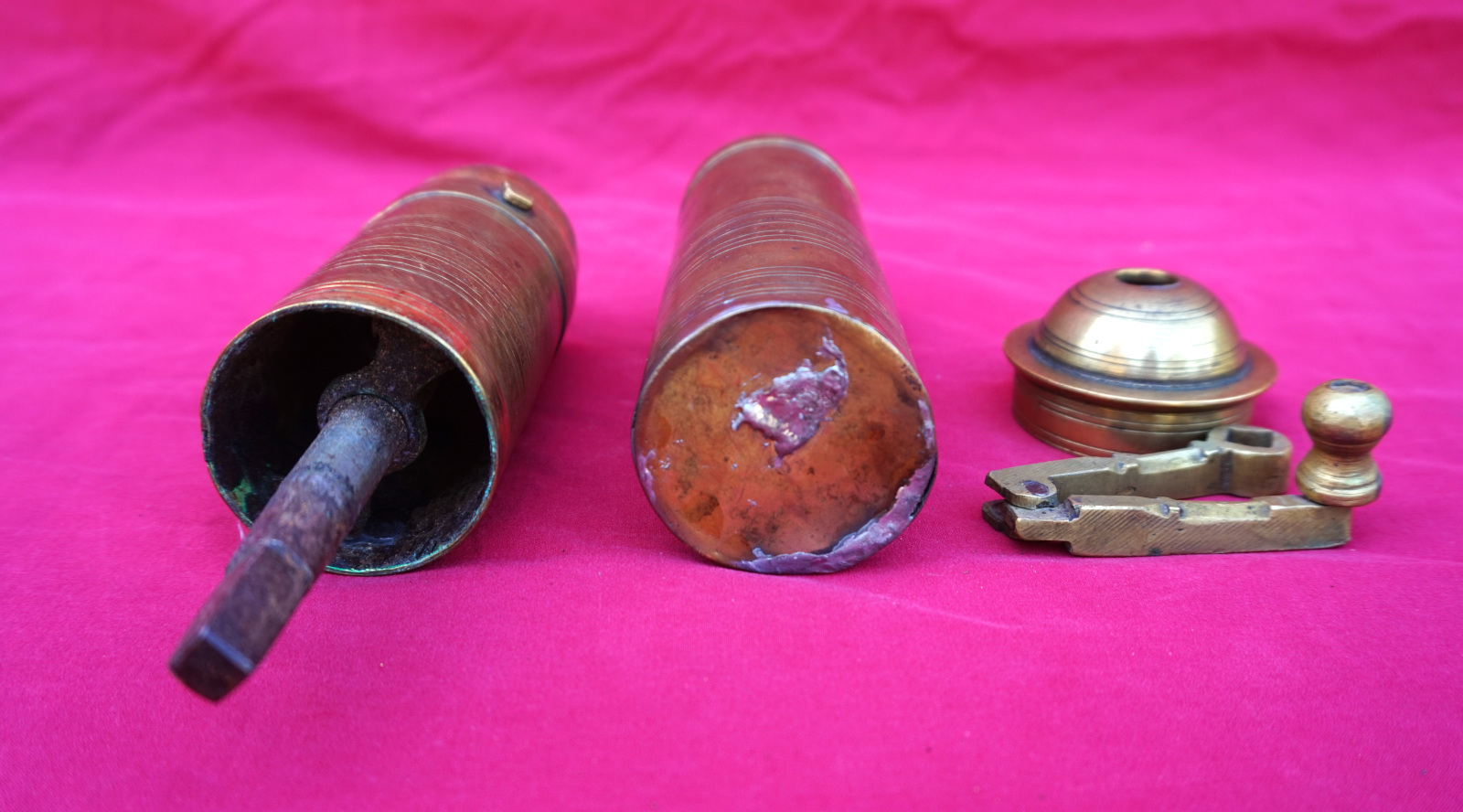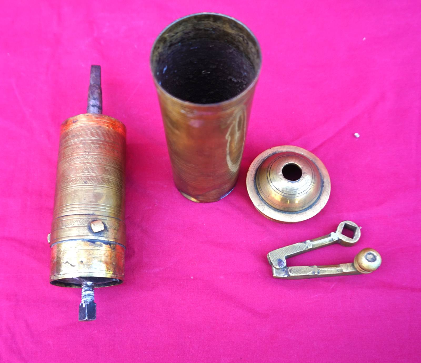 Turkish engraved brass coffee grinder engraved 5 crescent moon 5 and 51 made during the1900's. 11 3/8" (29cm) height, 2 1/2" (6.3cm) diameter. Good condition.