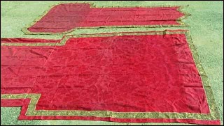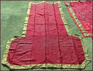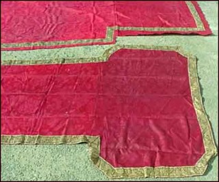 These altar armchair curtains in red cotton damask surrounded by a large gold wire braid have been made at the beginning of the 19th century. They have a few weather damages and smalls holes. 87" 7/8 x 51"1/8 for one and 97"5/8 x 22"1/2 for the other.