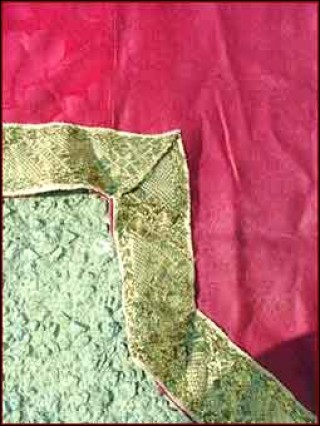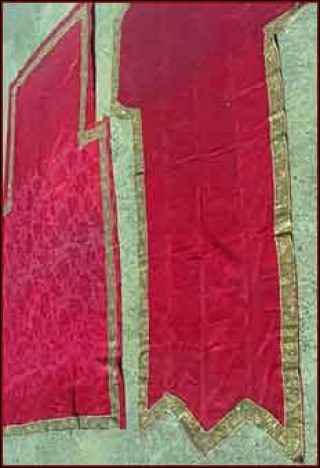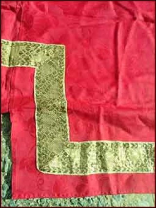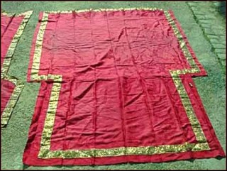 Portières de chapelle en damassé de coton orné d'un large galon de fils d'or. Elles sont nées au début du XIX ème siècle, les tissus a quelques usures et petits trous.