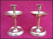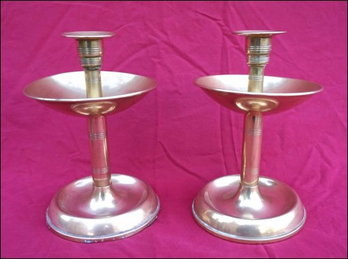 This pair of altar candlesticks in brass has been made in France around the middle of the 19th century. They are signed with the stamp of the CED factory on the back.8" tall 5" diameter. Good condition the pictures shows they leaning but really they are straights.