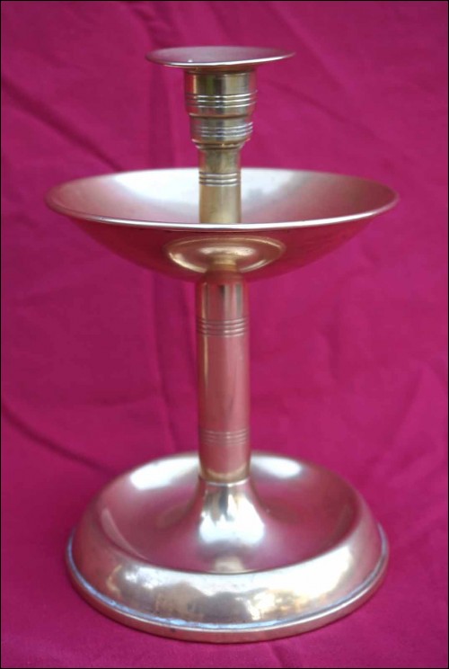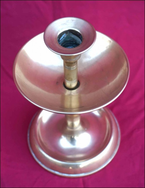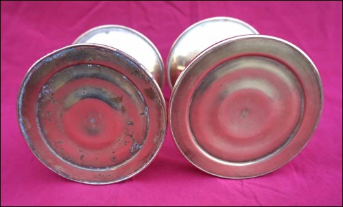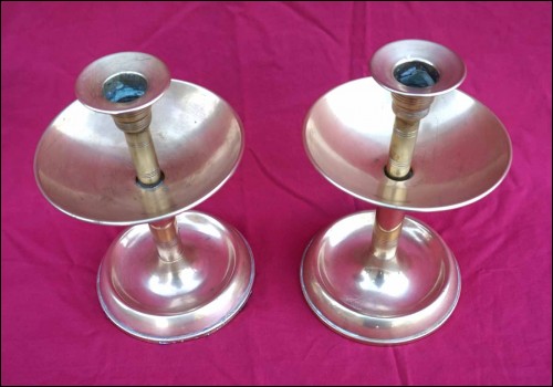 Paire de bougeoir d'église en tôle de laiton doublé à double bobèche. Ils sont né en France au milieu du XIX° siècle. Ils sont signé de l'écusson aux épées avec les marques C.E.D. La photo les fait croire penchés mais ils sont droits et en bon état. Hauteur 20 cm, diamètre 12,5 cm.