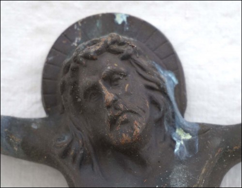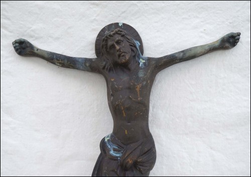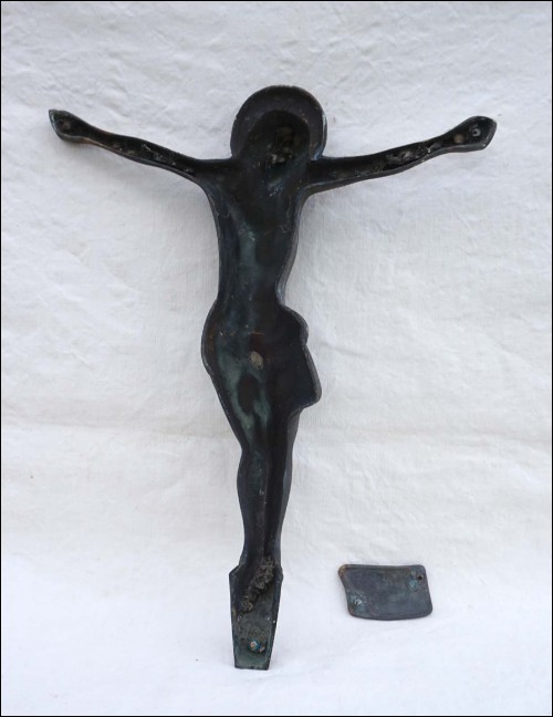 Christ en bronze par A Dubois repris de ciselure, traces d'oxydation, avec sa plaque INRI. Hauteur 42.5 cm, largeur 33.5 cm.