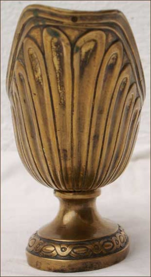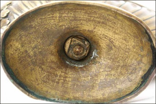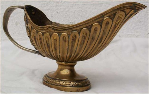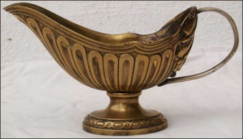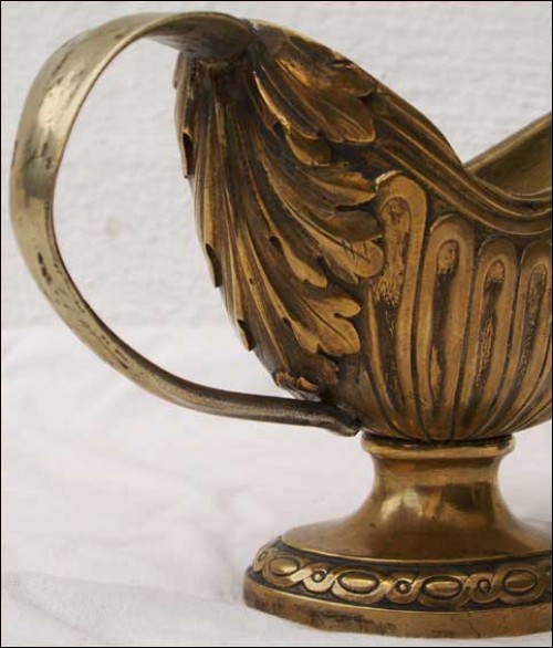Navette en bronze du XVIII ème siècle pour la réserve de l'encens dans l'office catholique. Un manche de cuillère lui a été rajouté pour la préhension. Elle a perdu sa cuillère. Hauteur 10,5 cm, longueur 20 cm, largeur 6,6 cm.