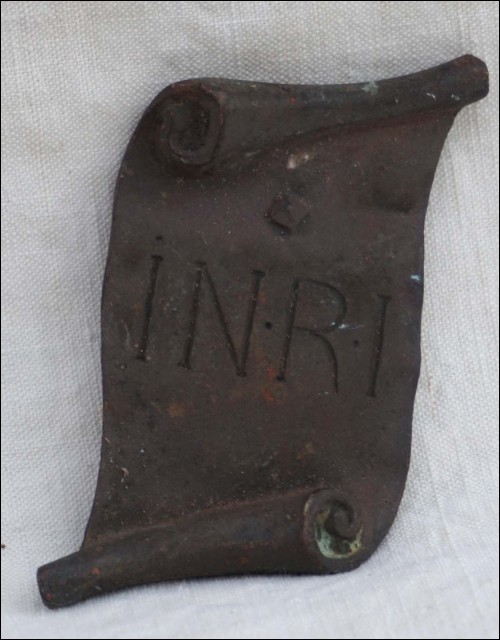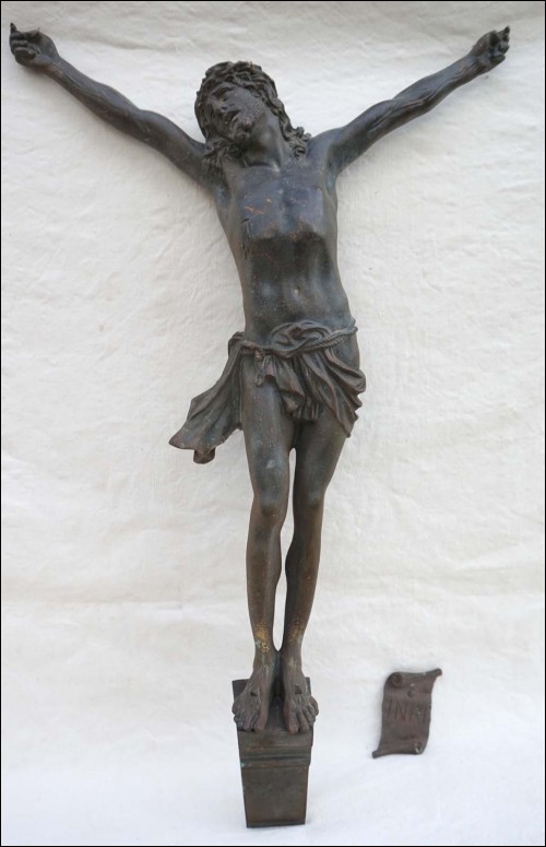 Antique large french crowned Christ in engraved bronze with INRI plate made by A Dubois during the 1900's. It's signed on the side. 23 5/8" (60cm) height 15" (38cm) width. Beautiful condition as presented on the following pictures.