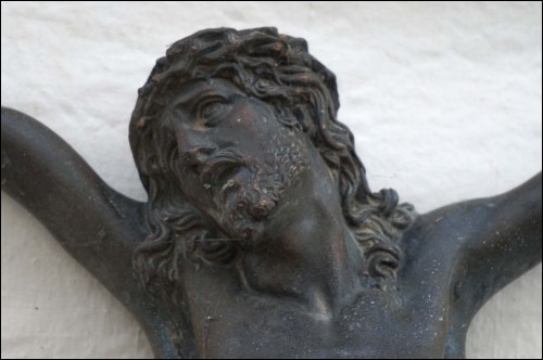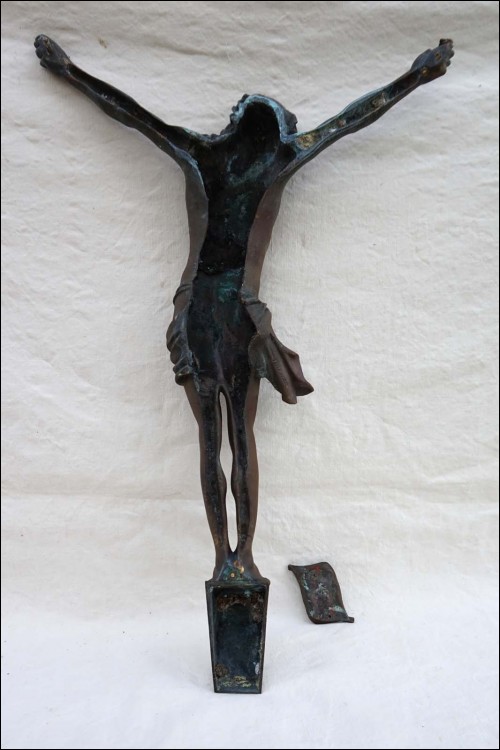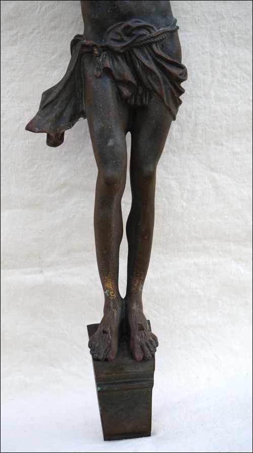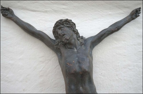 Grand Christ en bronze par A Dubois repris de ciselure, traces d'oxydation. Hauteur 60 cm, largeur 38 cm.