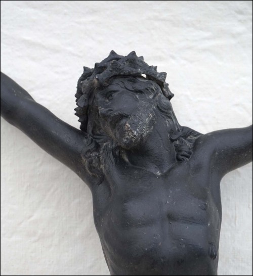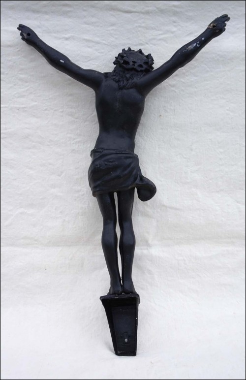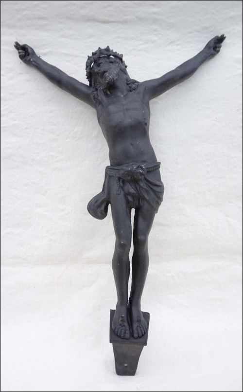 Antique french large crowned Christ in zinc with black patina made during the 1900's. It's stamped on the back. 22" (56cm) height 14 1/8" (36cm) width. Good condition as presented on the following pictures.