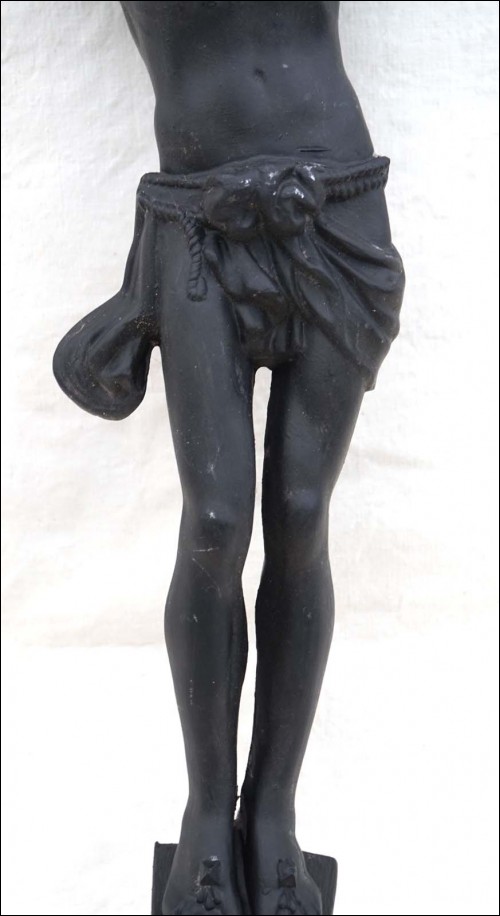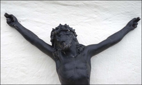 Grand Christ en zinc, patine peinte, cachet de fondeur. Hauteur 56 cm, largeur 36 cm.