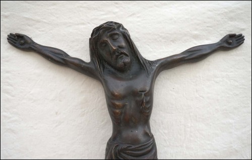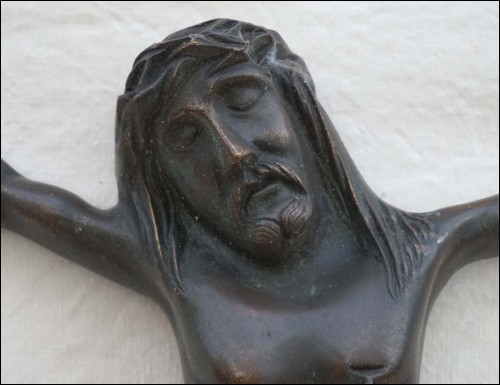 Grand Christ en bronze à décor de patine brune, d'époque Art Deco. Hauteur 53 cm, largeur 43 cm. Très bel état.