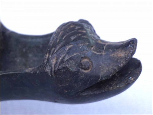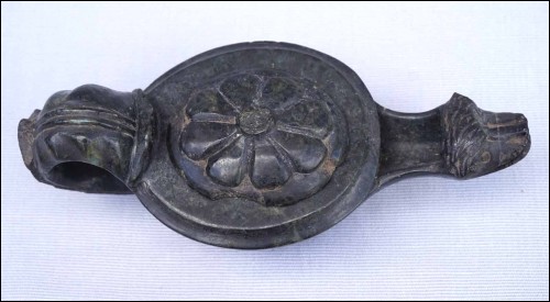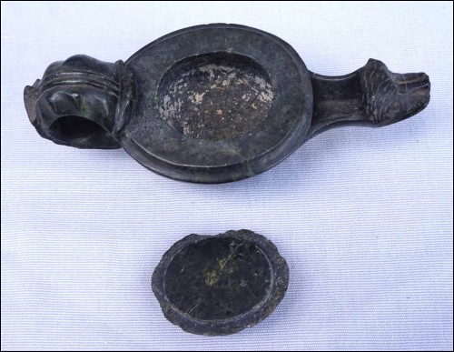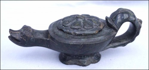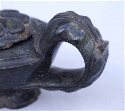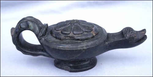 Lampe à huile en marbre vert antique en forme d'animal mythologique, période Baroque époque Louis XIV. Longueur 17.7 cm, largeur 8 cm, hauteur 6.7 cm. Cornes cassés, retour de palmette de la poignées manquants, recollée au cou, et accidents à la base.
