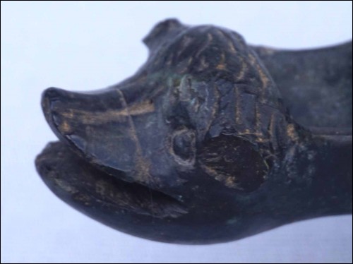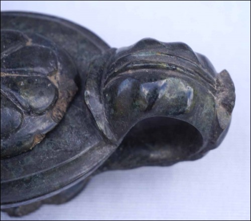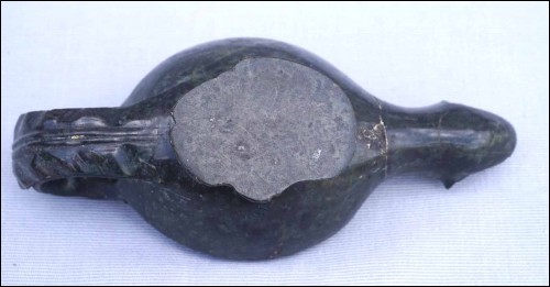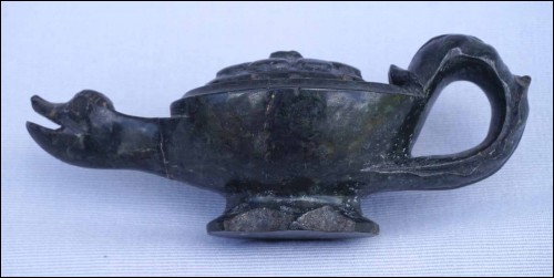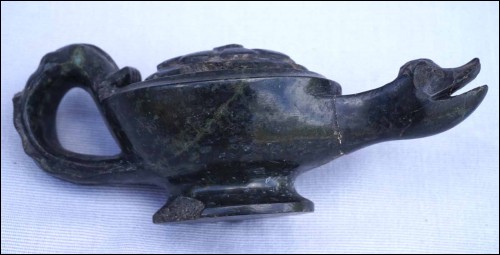 Antique mythological animal shaped oil lamp in green marble made during Barroco area Louis XIV period. 7" (17.7cm) length, 3 1/8" (8cm) width, 2 5/8" (6.7cm) height. The horns are missing, the end of the handle is missing, repair and glued on the neck and chips to the base as shown by the following pictures.