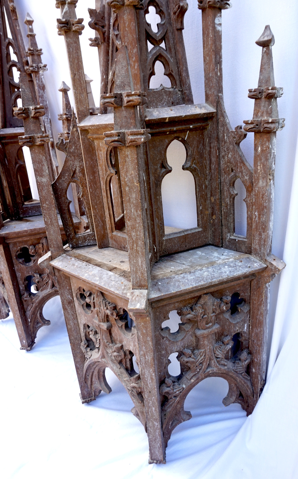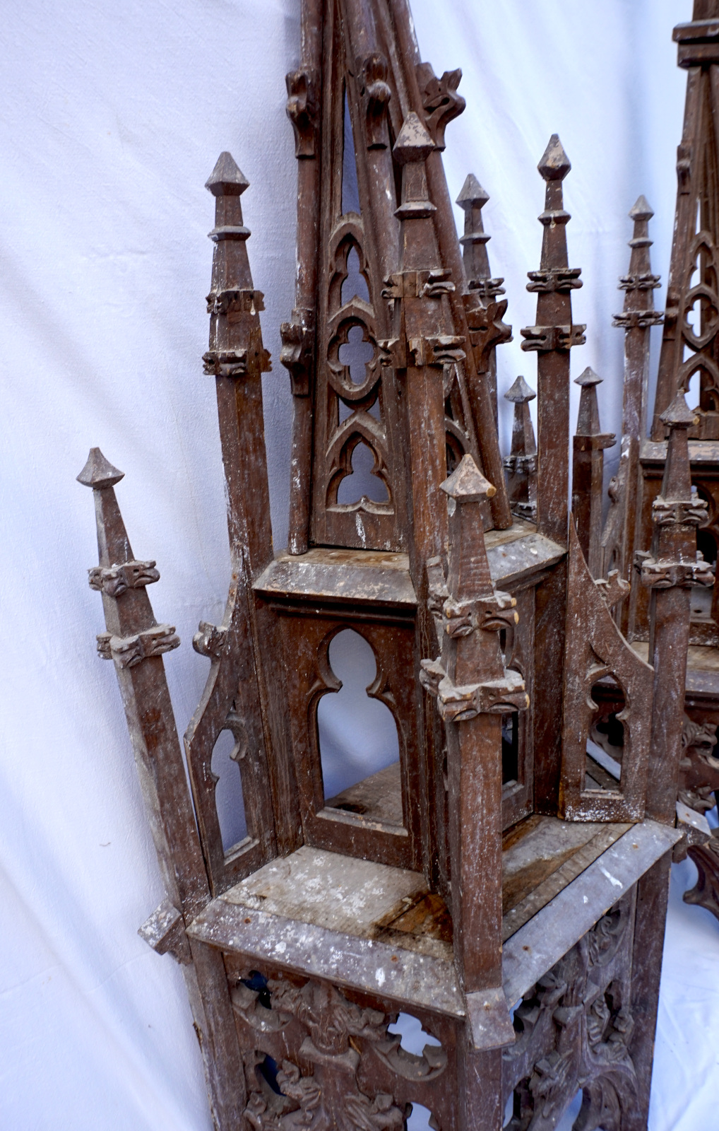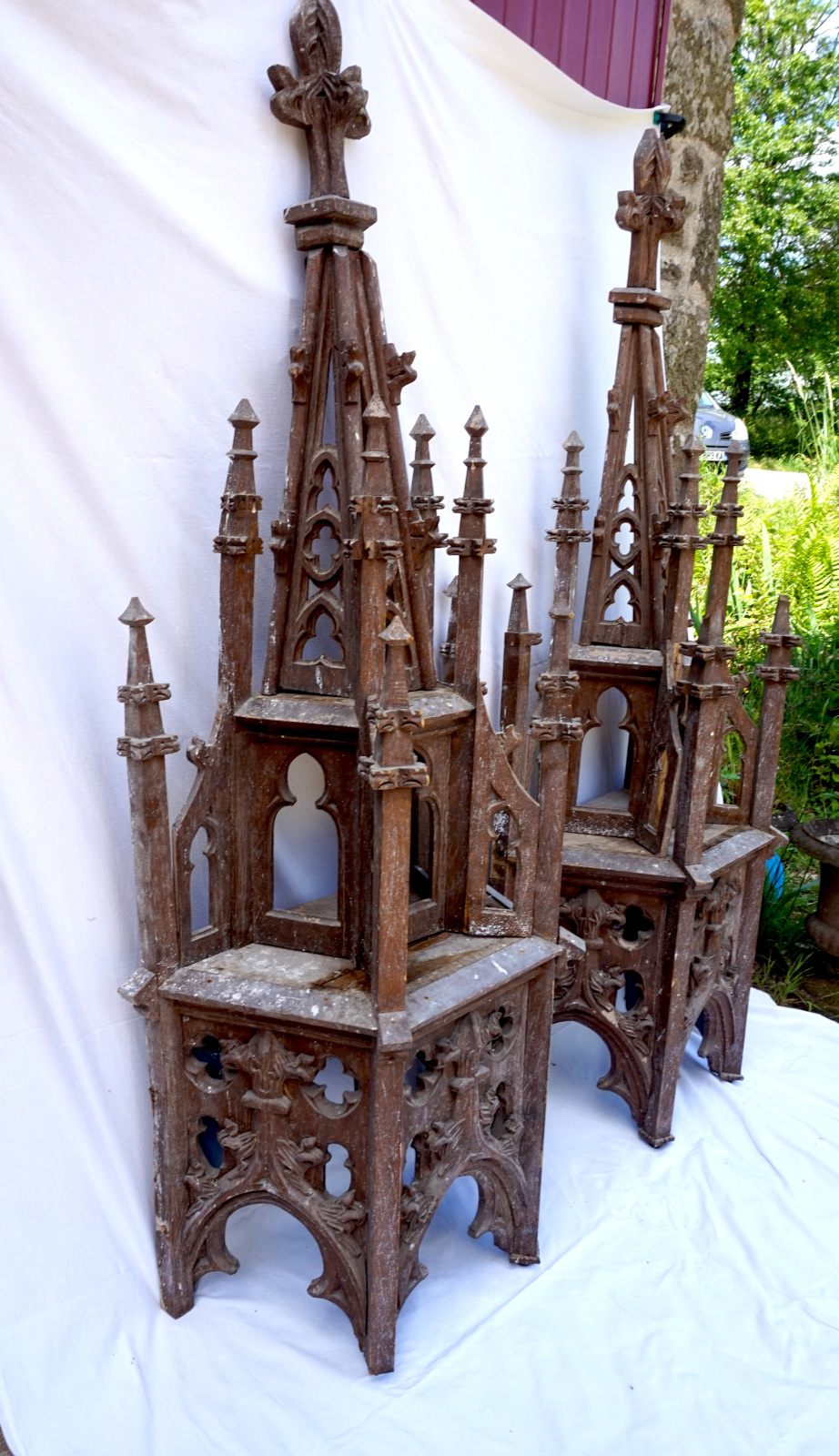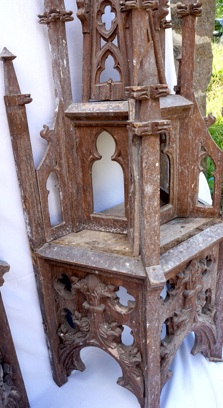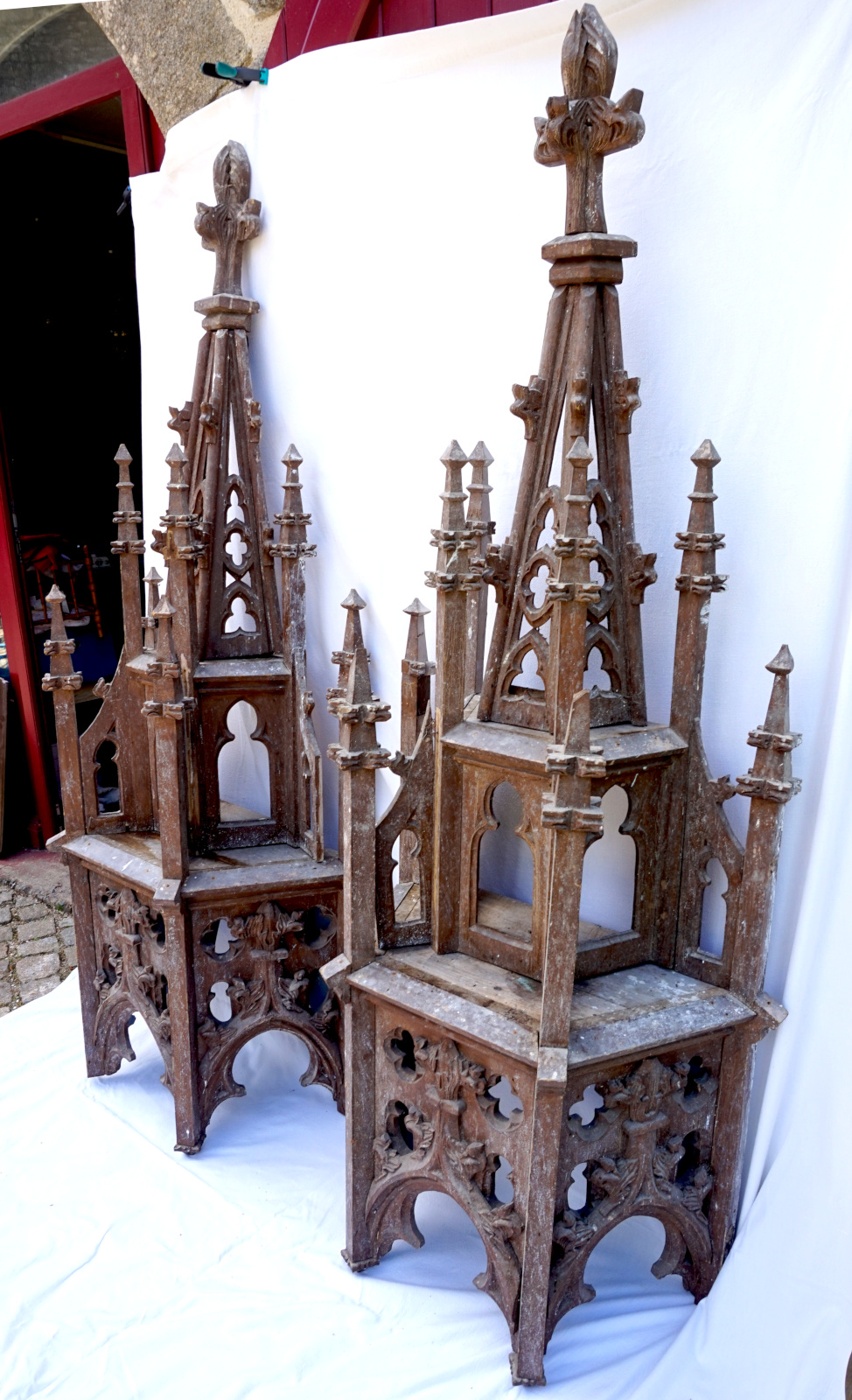 French gothic carved wood pair of statue canopies for chapel or church made late 19th century. They measure: 74 3/4" (190cm) total height, 30" (76cm) width, 15" (38cm) depth, weight for each canopy 46lbs. Good condition, they need small repairs as shown by the following pictures.
