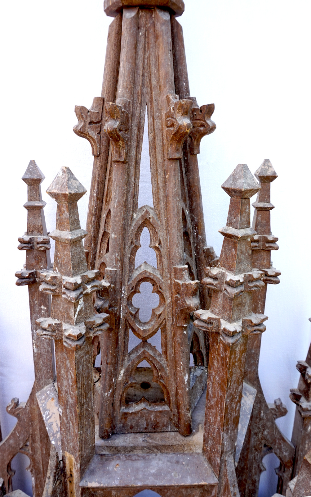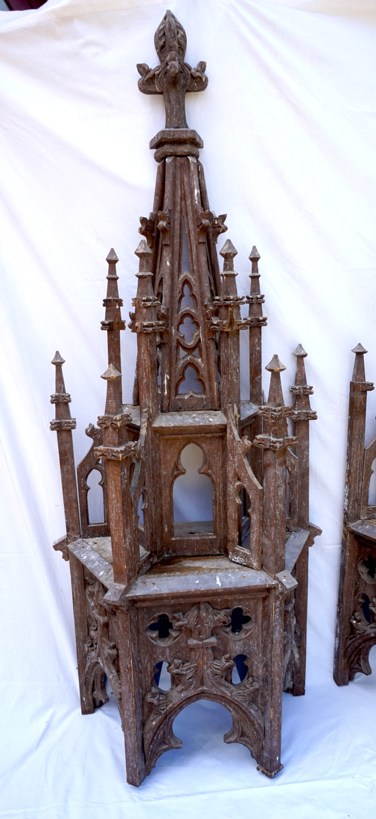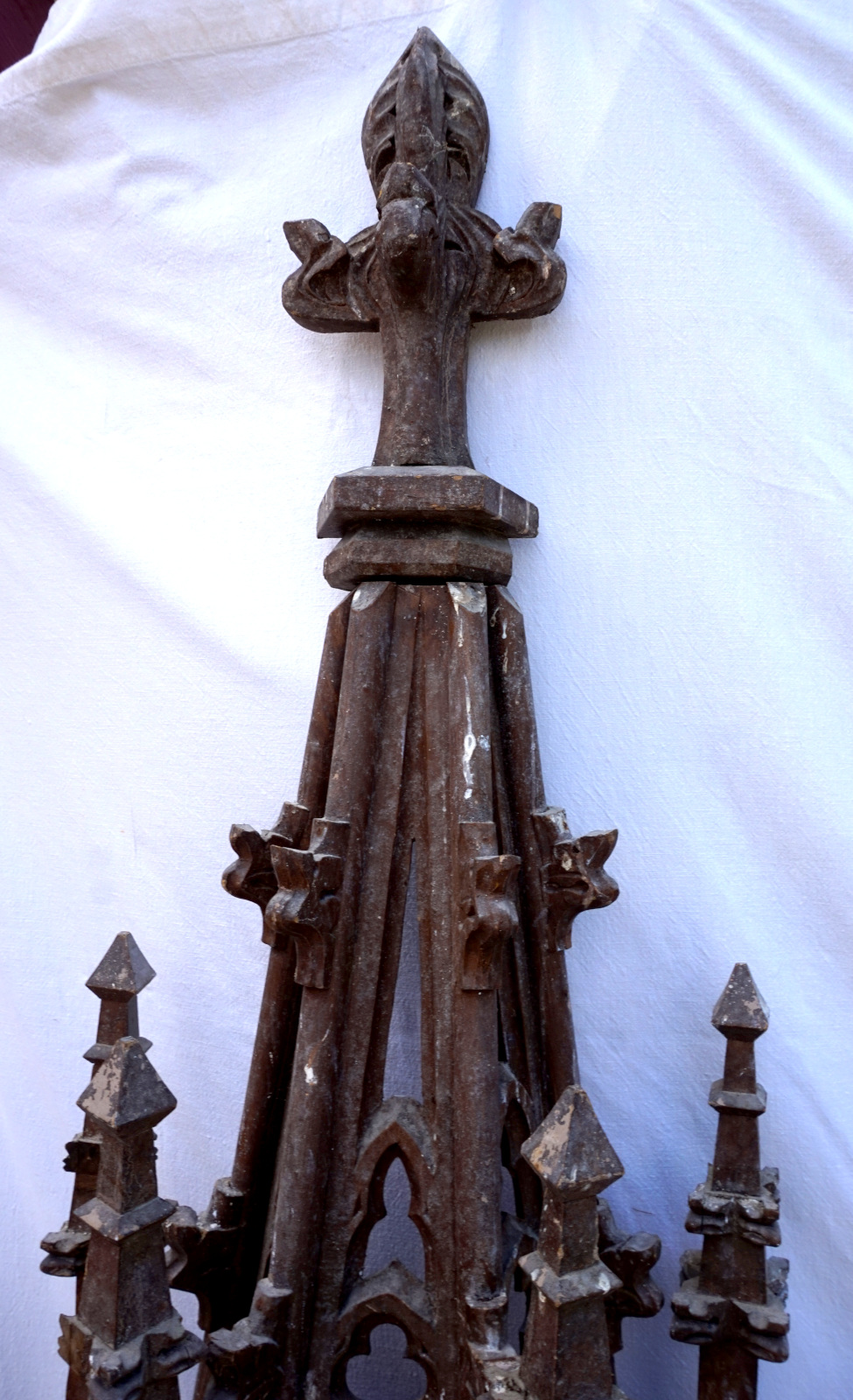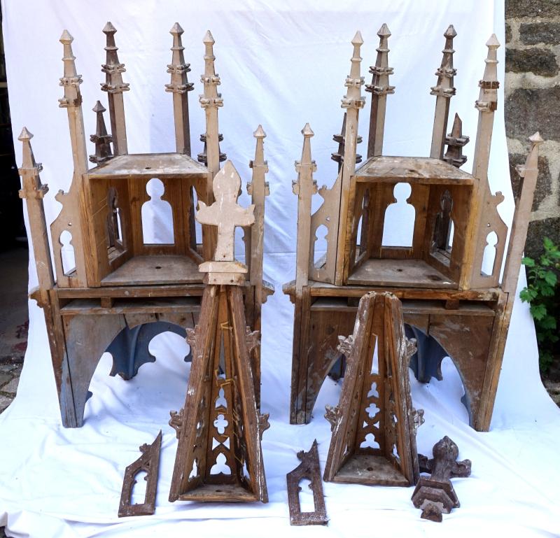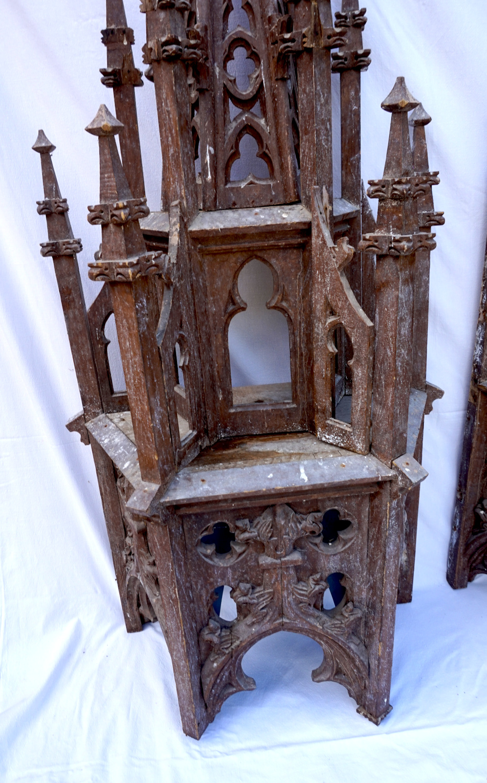 French gothic carved wood pair of statue canopies for chapel or church made late 19th century. They measure: 74 3/4" (190cm) total height, 30" (76cm) width, 15" (38cm) depth, weight for each canopy 46lbs. Good condition, they need small repairs as shown by the following pictures.