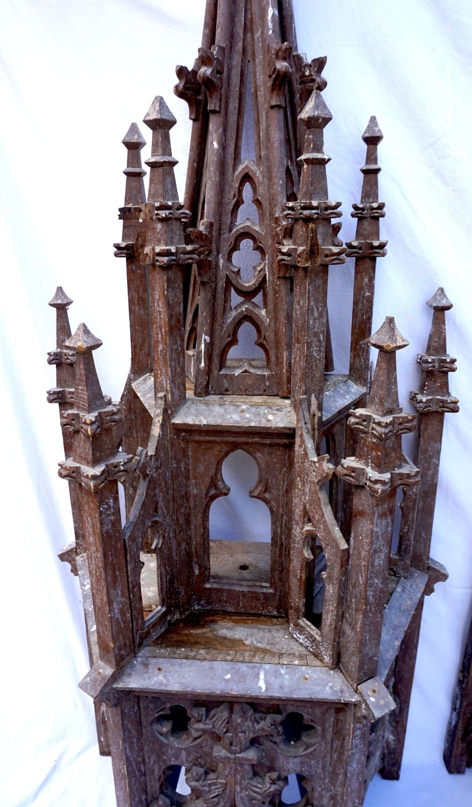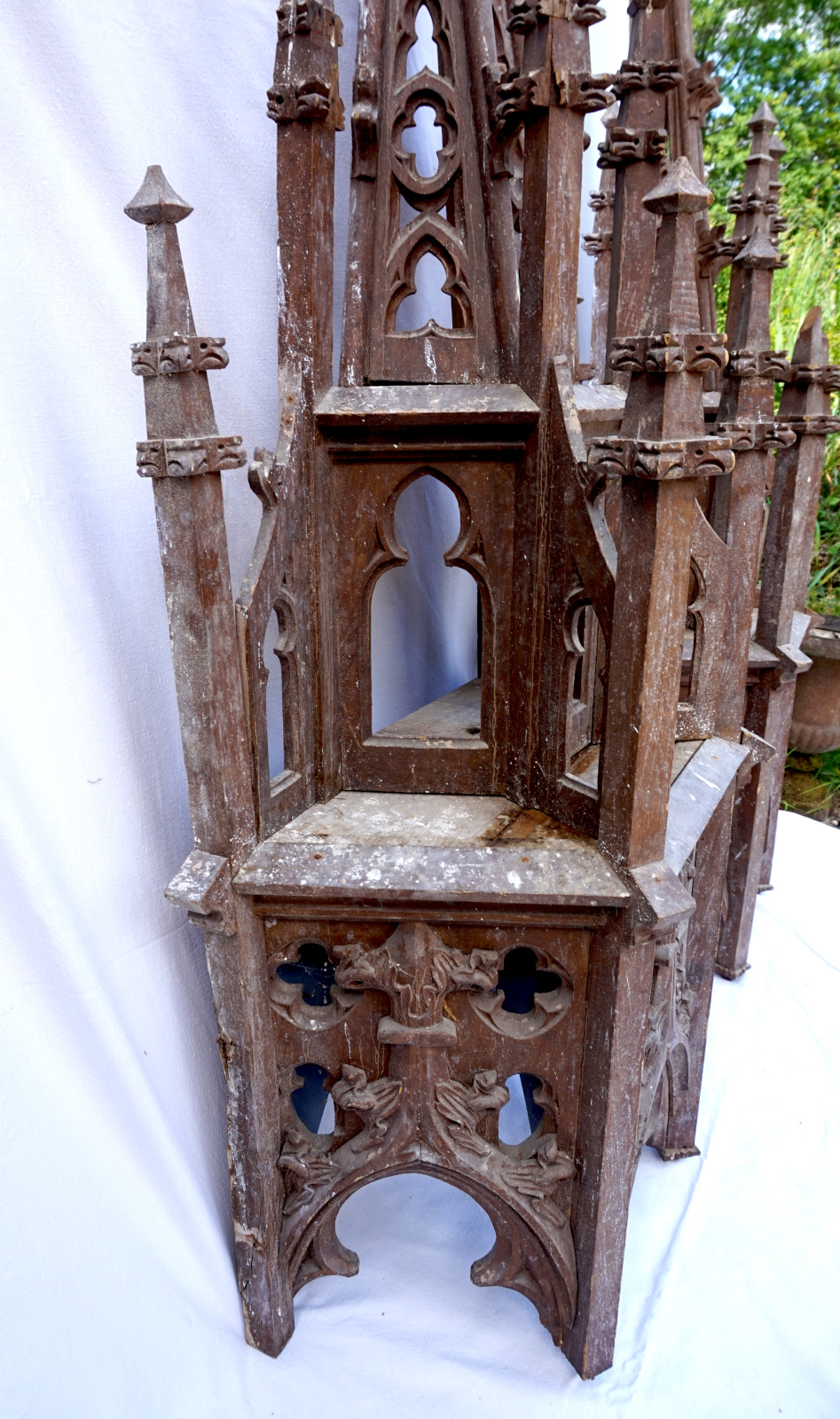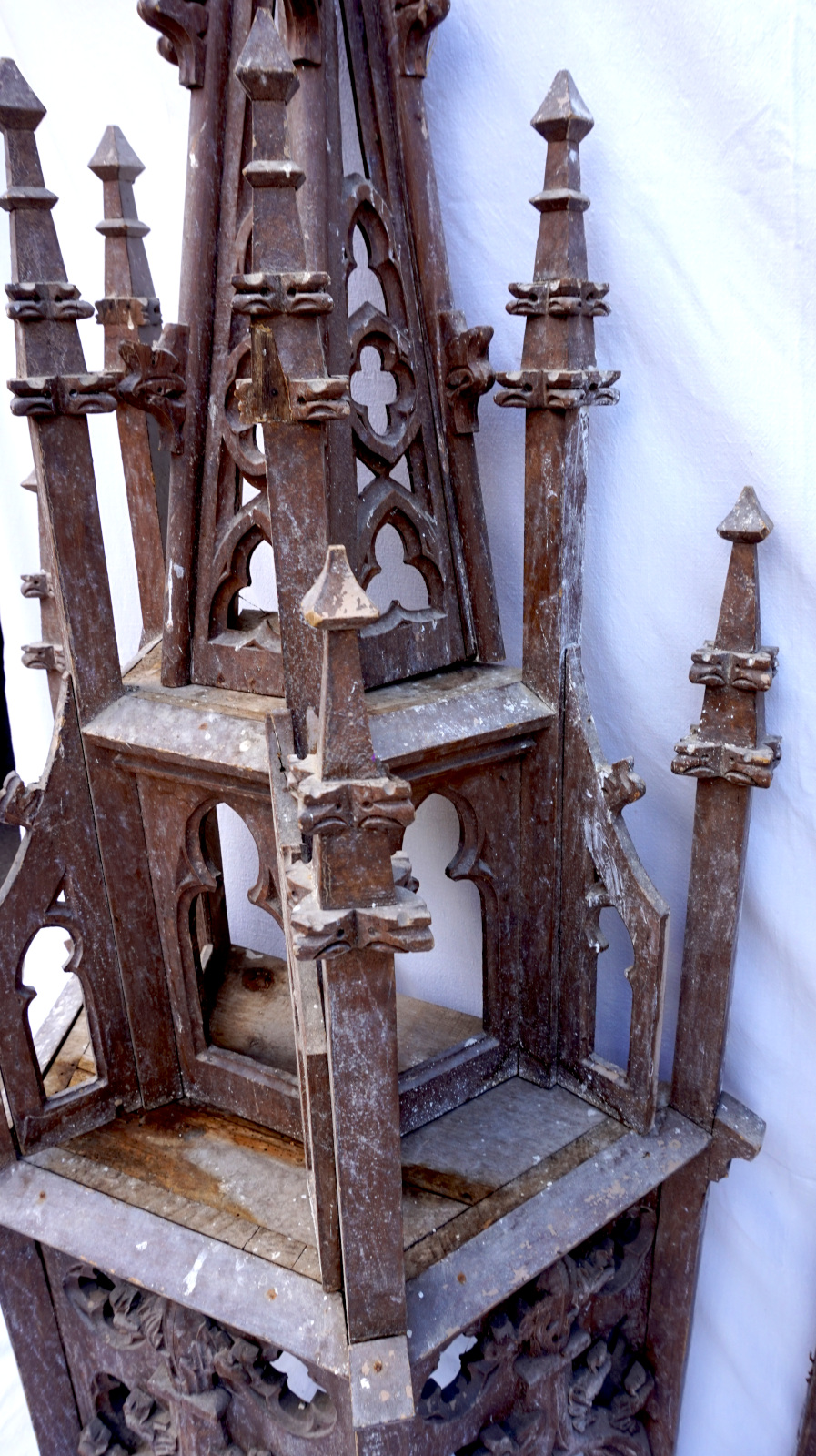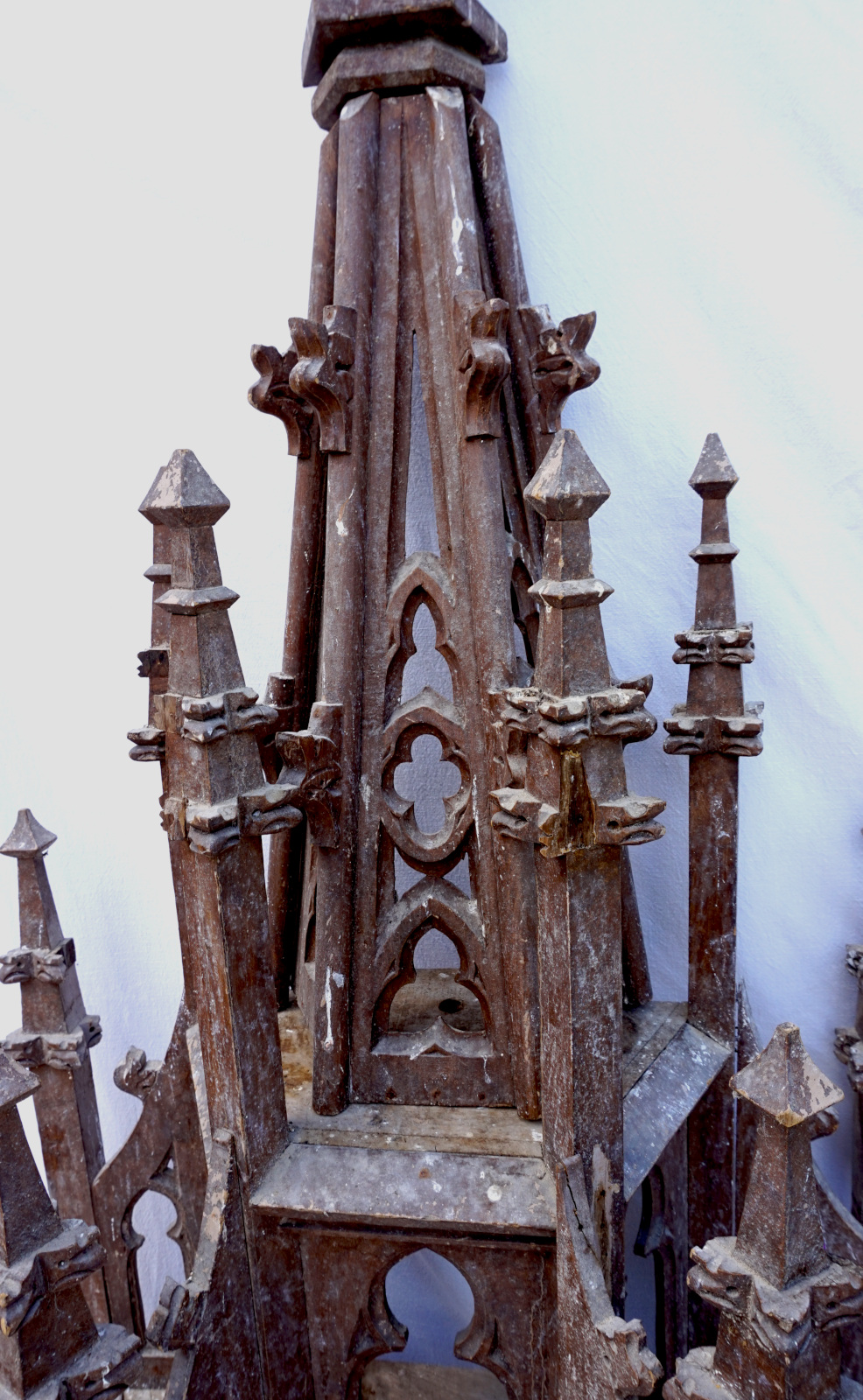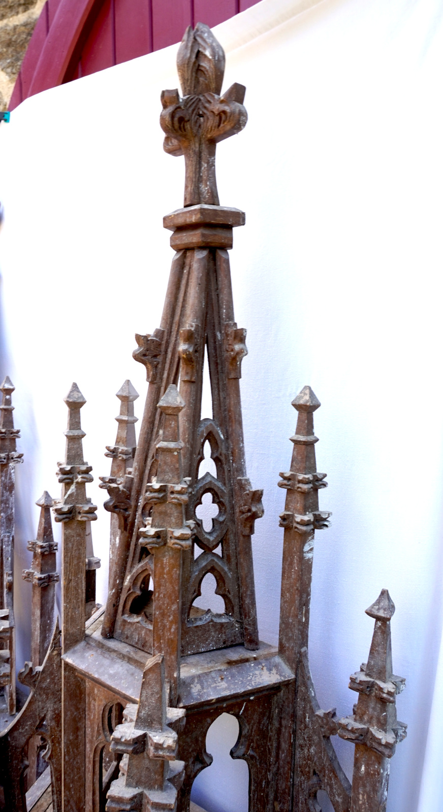 French gothic carved wood pair of statue canopies for chapel or church made late 19th century. They measure: 74 3/4" (190cm) total height, 30" (76cm) width, 15" (38cm) depth, weight for each canopy 46lbs. Good condition, they need small repairs as shown by the following pictures.