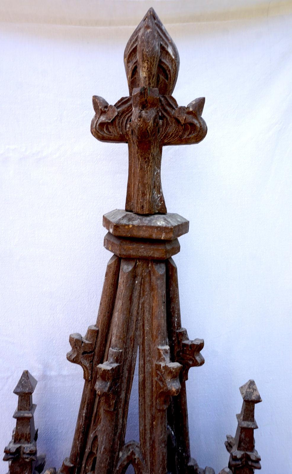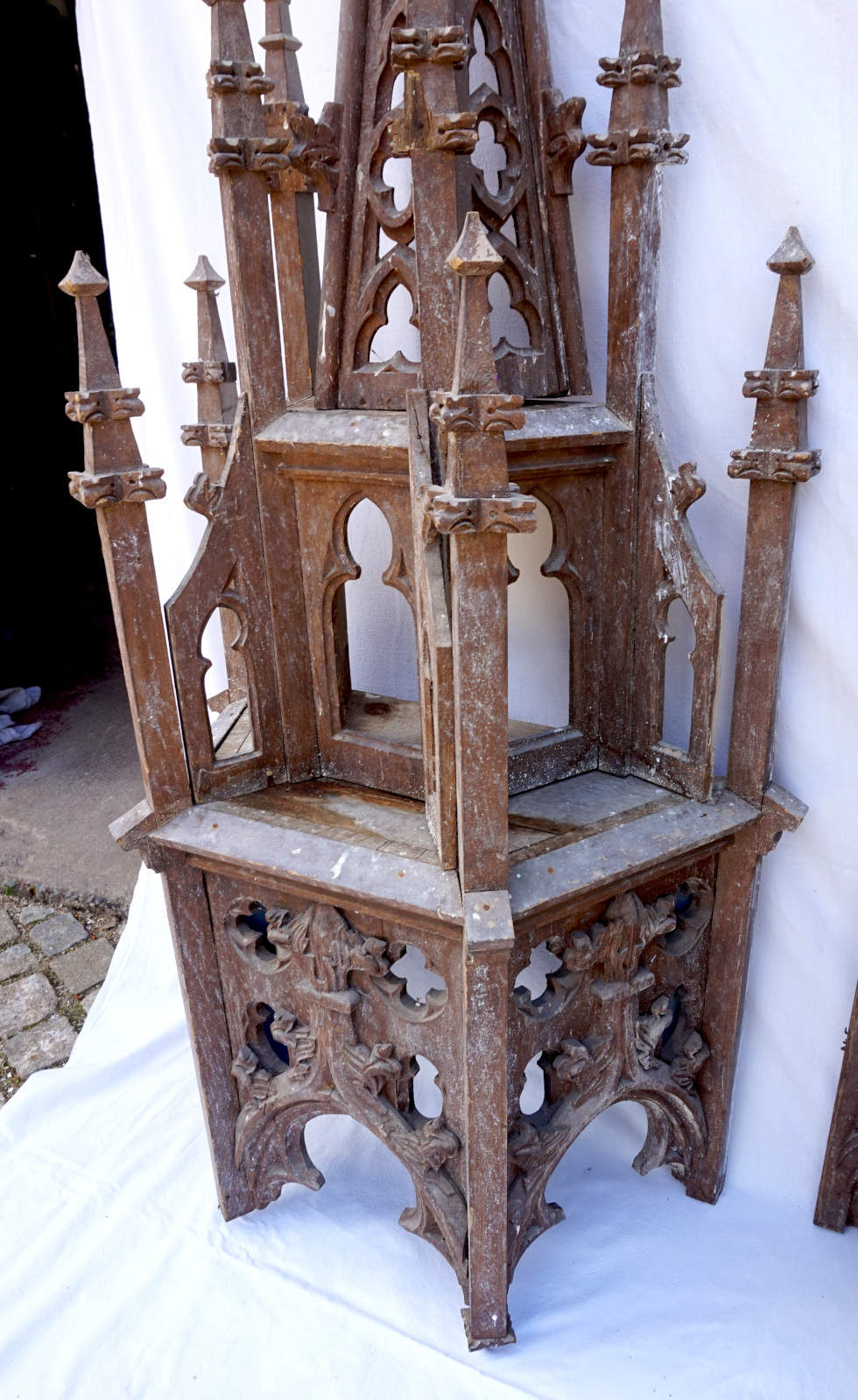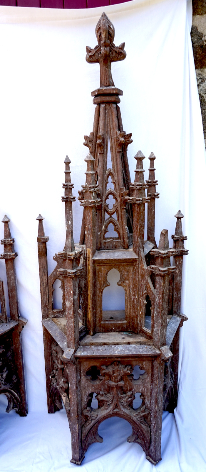 Paire de dais pour chapelle de style Gothique en bois sculpté fin XIX° siècle. Hauteur totale 190cm, largeur 76cm, profondeur 38cm, poids de chaque dais 21kg. Bel état, quelques petits manques.