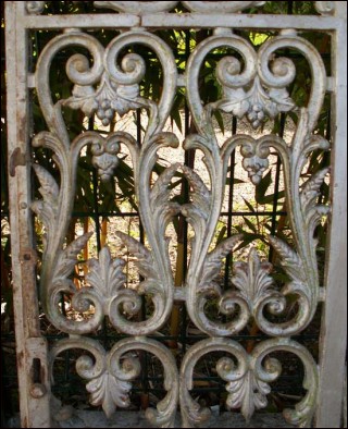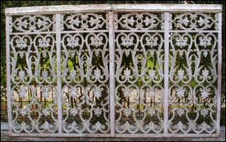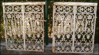 Paire de portes de choeur d'autel en fonte d'époque Louis XIV vers 1680. Elles sont encadrées d'un chassis de fer avec pomelles et partie de ferrures de fermeture. Elles possèdent encore en dessous leurs peintures vert printemps d'origine. Bon état les mains courantes sont à changer. Dimensions 131 cm de long par 82 cm de haut.
