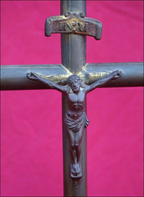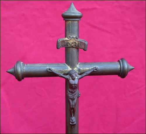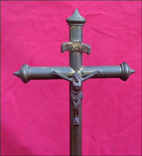 Crucifix d'autel gothique en laiton doré, au dessus du Christ le symbole INRI, deuxième moitié du XIX° siècle. Hauteur 33.5 cm, largeur 16.5 cm. Très bel état.