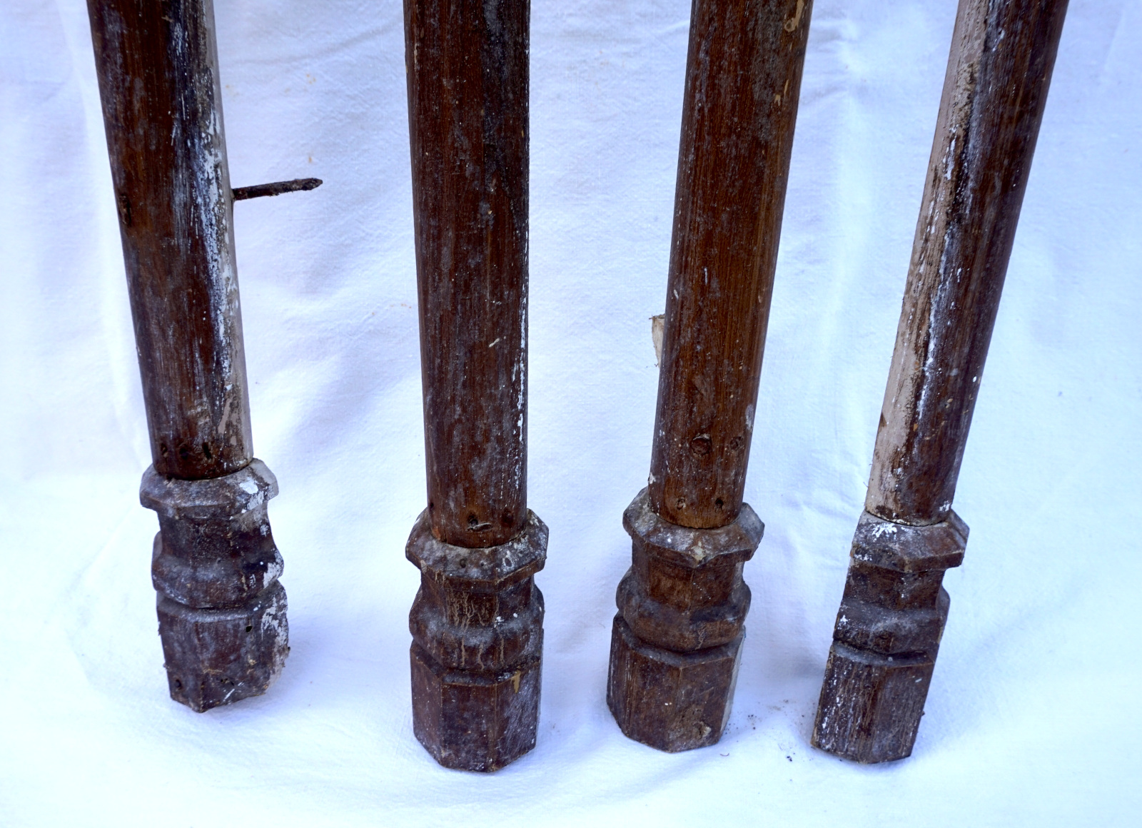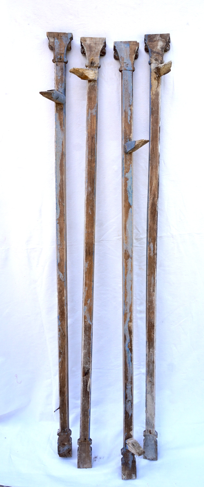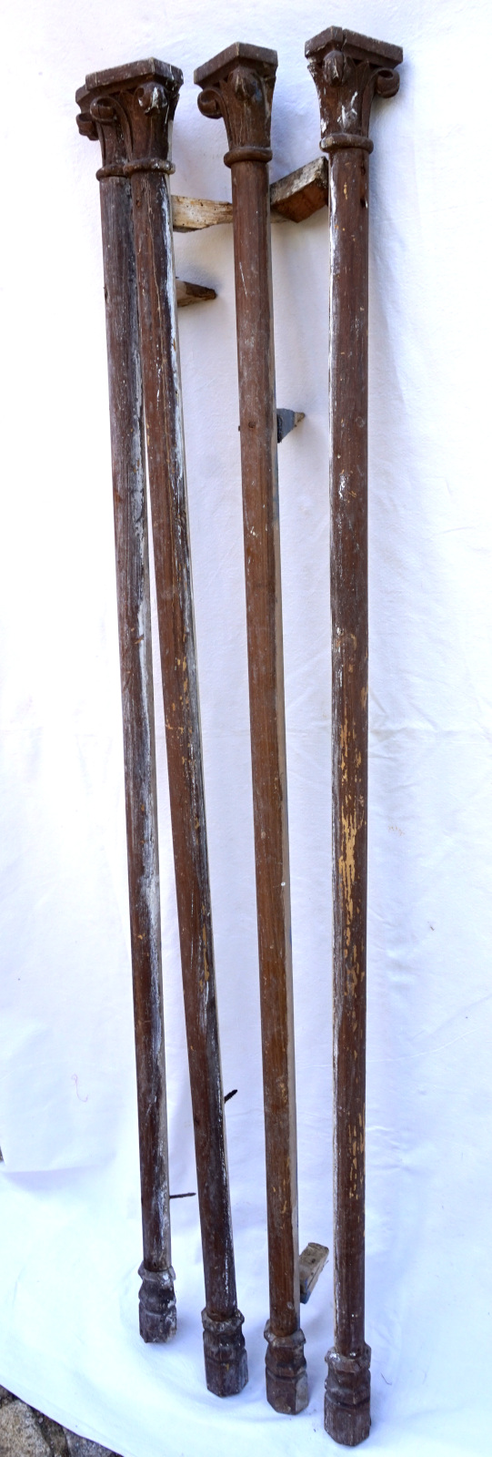French gothic carved wood set of 4 columns made late 19th century. They measure 61"(155cm) total height, 3 3/8" (8.5cm) width, 2" (5cm) depth, weight of the set 11lbs (5 kilograms). Good condition, with a few small damages.