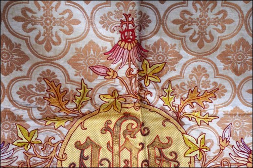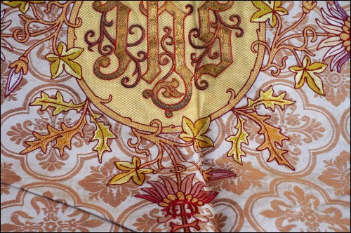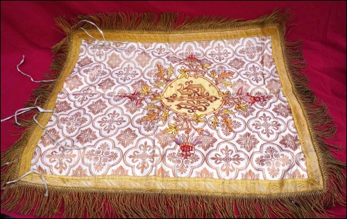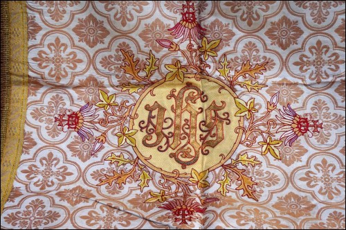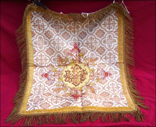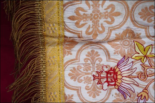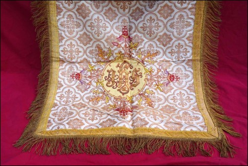 Altar curtain in damask silk with IHS embroidery in medallion and surrounded by mettalic gold braid and fringe made early 20th century. 30 1/4" (77cm) height, 20 1/2" (70cm) width. The damask is used as shown by the following pictures.