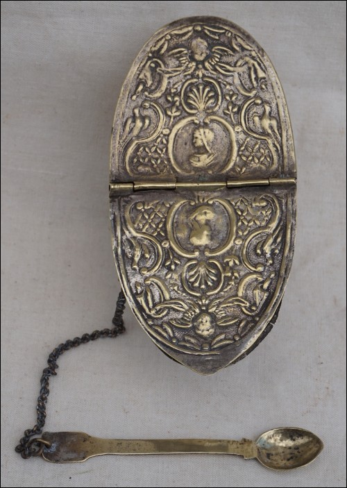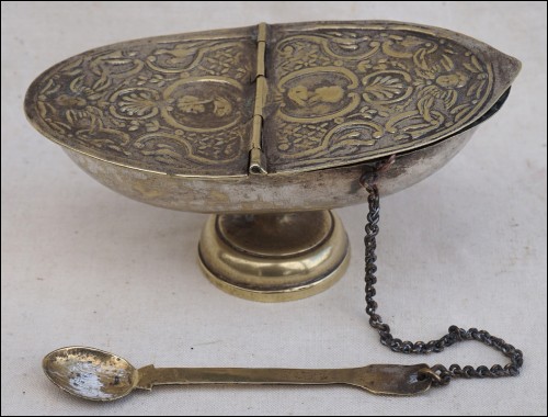 Antique incense boat with hinged lid and spoon in brass repousse made during the 18th century Louis XIV period. 5 3/4" length 2 7/8" width 2 3/4" height. Good condition with beautiful patina as presented on the folowing pictures.