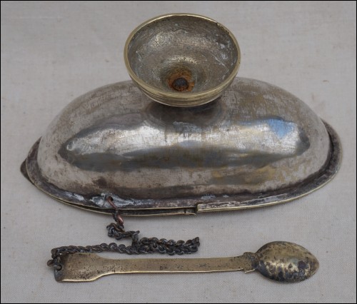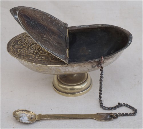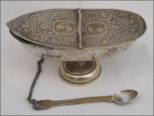 Navette en laiton repoussé d'époque Louis XIV, avec sa pelle à encens. Il est né argenté, bel état d'usage. Hauteur 7 cm, longueur 14,5 cm, largeur 7,3 cm.