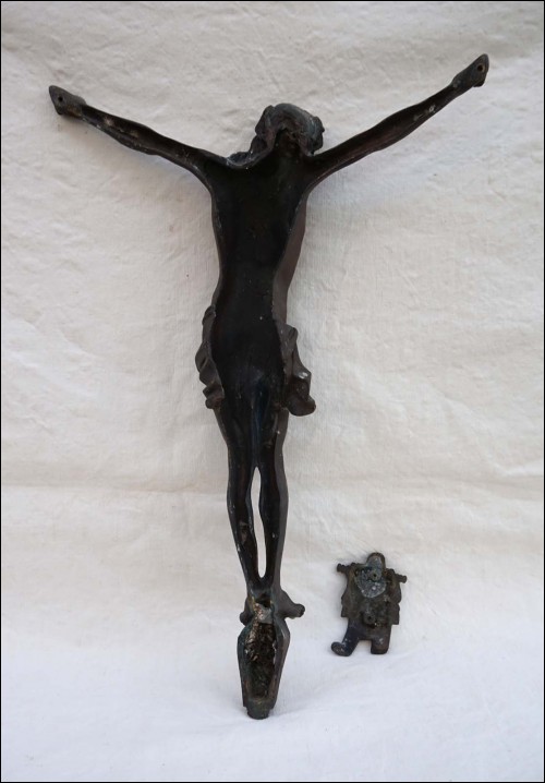 Grand Christ en bronze par J Rabiant, repris de ciselure, cachet d'éditeur, patine oxydée avec sa plaque INRI. Hauteur 48,5 cm, largeur 32,5 cm.