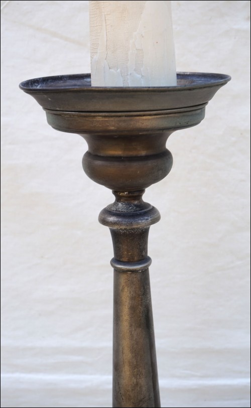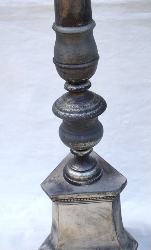 Large altar candlestick in silver plated solid and tole brass made in France during the 1910's. The base in solid brass is ballasted. 54" (137cm) height overall 34 1/4" (87cm) height for the candlestick 9" (23cm) by side for the base. Good condition its need to be cleaned and re-wired to the US standard as presented on the following pictures.