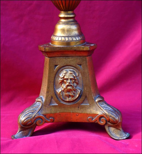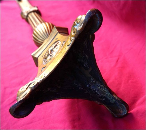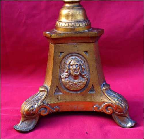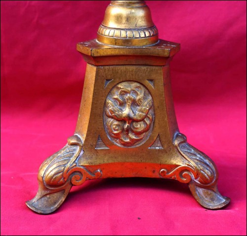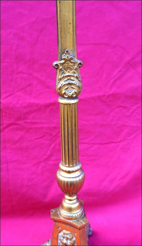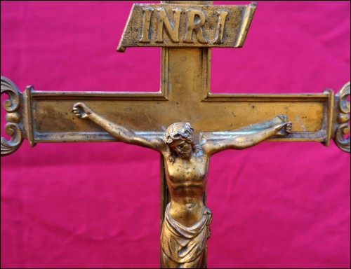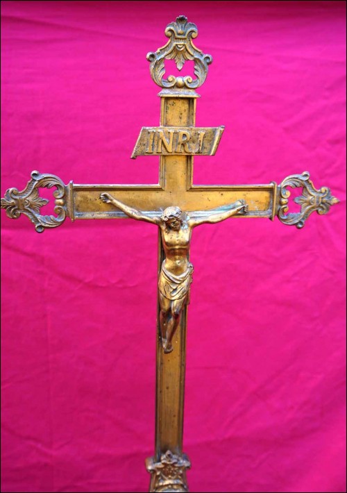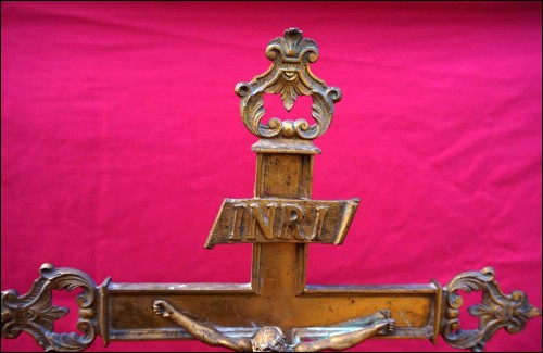 Grand crucifix d'autel en bronze doré, deuxième moitié du XIX° siècle. Hauteur 77 cm, largeur 26.7 cm, profondeur à la base 13.5 cm. Bel état.