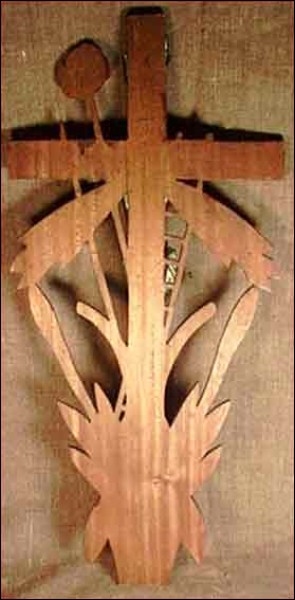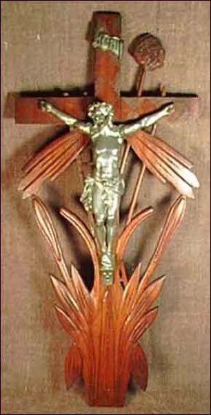 This large black forest crucifix in silvered spelter has been made in Quimper around 1910. The wooden cross is all hand working. On the top of Christ stands INRI. Good condition only the wooden ladder the pilum and the pedestal are missing. 25"1/4 tall 11"1/2 width. Christ is pierced on the top of head.