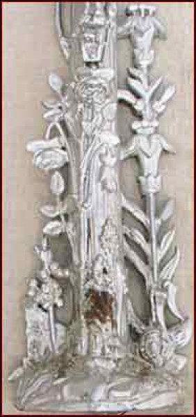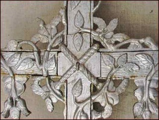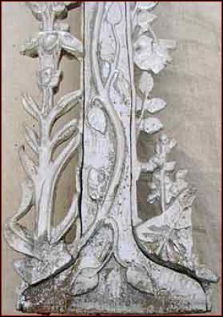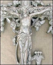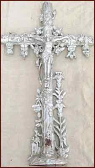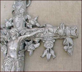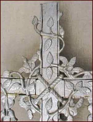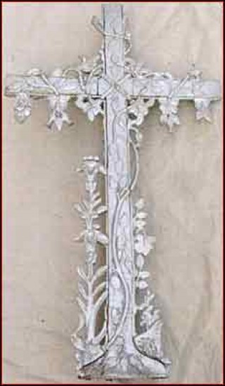 Crucifix de calvaire en fonte né vers en 1900. Très ornemental, la croix façon bois supporte un rosier en fleurs, au pied le lys est aussi en fleurs, les symboles de la vie et de la résurrection. Elle est en bon état malgré une casse au dos de la croix. Hauteur 99 cm, largeur 56 cm.