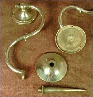 Paire de pic cierge en bronze argenté, vers 1800-10. Ils sont orientables et rabattables, la platine se fixe sur le maître-autel. Ils sont d'époque Empire, leur argenture est d'origine et légèrement usée. Profondeur 25 cm.