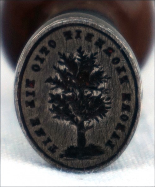 German church, theologian or refomed poet sterling silver and lime tree seal made late 17th or early 18th century. The latin moto is "labore florebit otio til erit" (that meditation flower the linden?) with tilia tree in the middle is engraved onthe sterling silver (.800) seal. 3 1/8" (8cm) height. Beautifull condition with tiny used as shown by the following pictures.