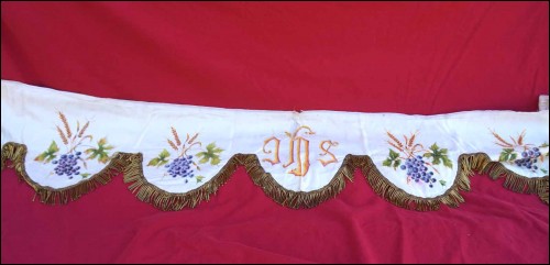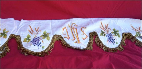 Set of 3 processionnal chair curtains, 1 largest and a pair, in painted silk showing grapes, wheat surrounde by gold metallic fringe. In the middle of the largest IHS. They measure for the largest 102 1/4" (2.60meters) length by 11" (28cm) width, for the pair 76 3/4" (1.95meters) length by 11" (28cm) width, the 3 curtains are endin by return of 31 1/2" (80cm) height. Good condition, the silk on IHS part is lighty used, as shown by the following pictures.