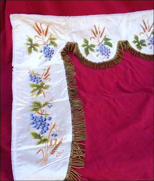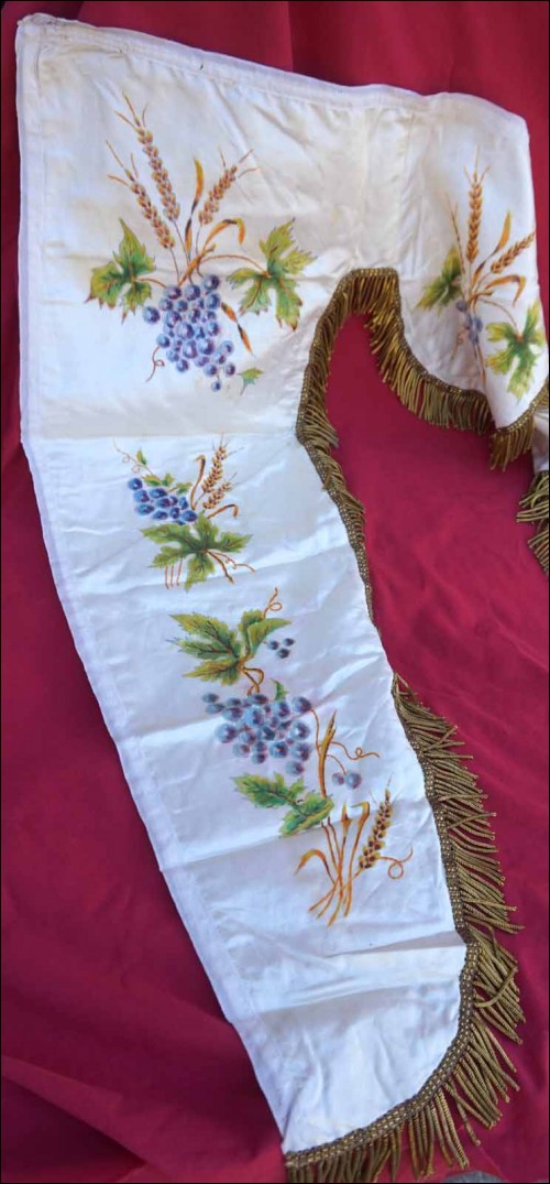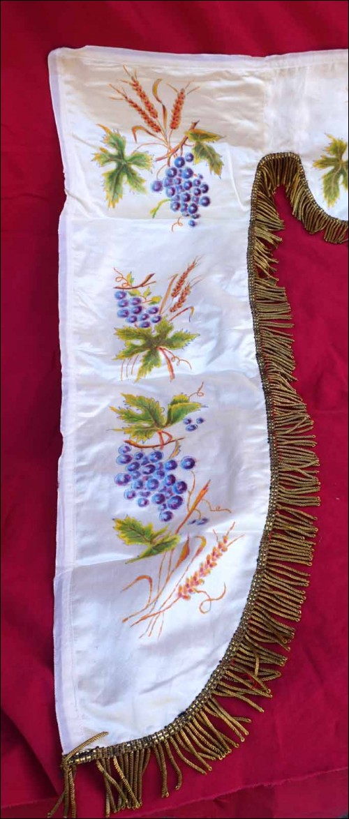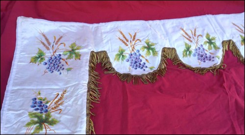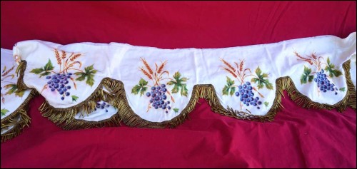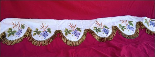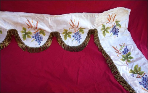Ensemble de 3 rideaux ( une paire + 1)de chaire de procession, en soie réhaussé de grappes et d'épis peints mains, et de galons métalliques doré. Dimensions pour la paire: longueur 1.95 cm, largeur 28 cm, retour à chaque extrémité 80 cm, pour le plus grand longueur 3.30 m, largeur 28 cm, largeur des retours 80 cm. Bon état, quelques usures.