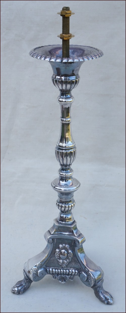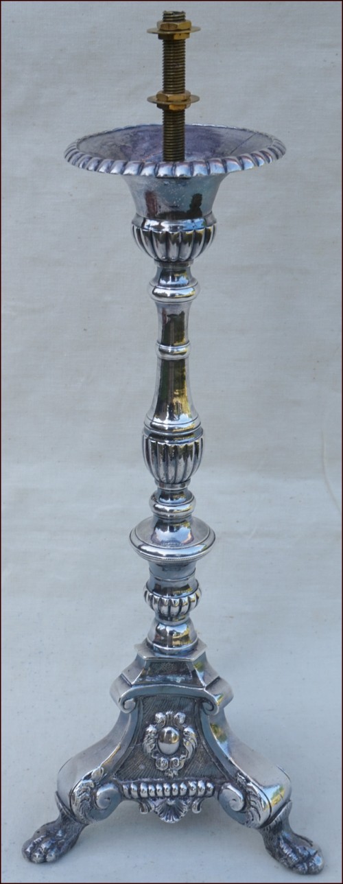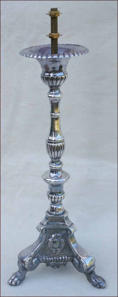 Antique french silvered brass candlestick with lion claws feet tripod base ornate with medallions made during the 1850's Louis XV period. It has been fit in lamp and re-silvered. 15 1/2" height. Good condition as presented on the following pictures.