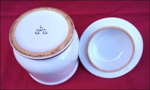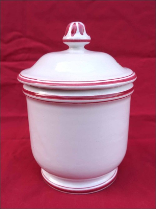 Pot d'apothicaire Alumen médicament homéopathique obtenu à partir de l'Alun pour les établissements de produits pharmaceutiques Léon Warin par Emile Tessier à Malicorne, vers 1968. Hauteur avec le couvercle 16,5 cm, diamètre 12,8 cm. Signé sur son fond. Très bel état, un éclat de vernis sous le couvercle, invisible de l'extérieur.