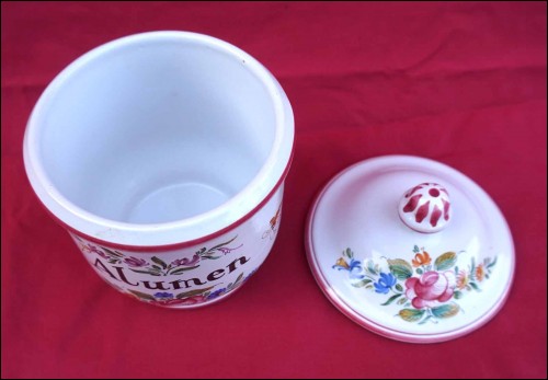 French hand painted faience apothicary jar for Alumen, alum, made by Emile Tessier in Malicorne for Léon Warin pharmaceutical company during the 1960's. It's signed on the bottom. 5" (12.8cm) diameter, 6 1/2" (16.5cm) height with the lid. Good condition , a tiny glaze shortage on the back of the lid not visible in front as shown by the following pictures.