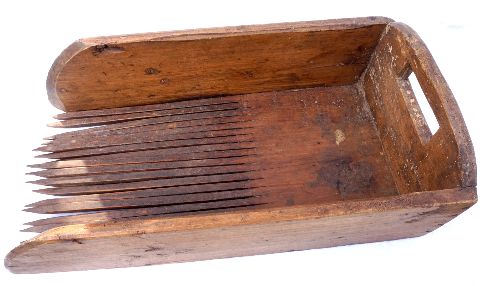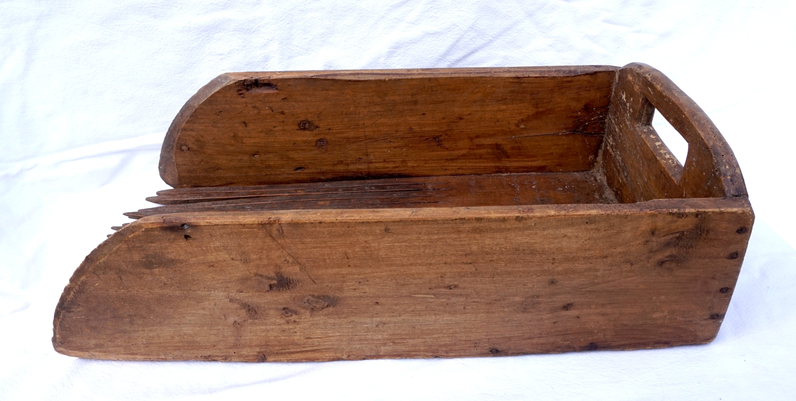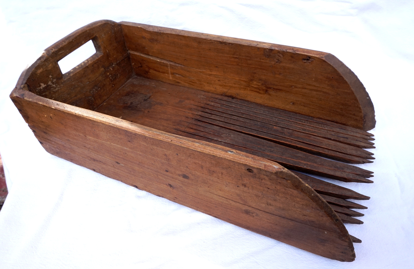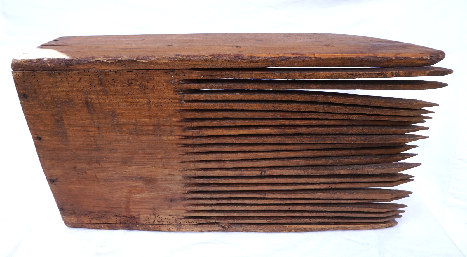 Grand peigne à myrtille en bois, pour les récoltes pharmaceutiques de Champagne, fin XIX° siècle. Longueur 58.5 cm, largeur 30.5 cm, hauteur 18 cm, poids 2.6 kg. Bel état, la poignée avant est manquante.