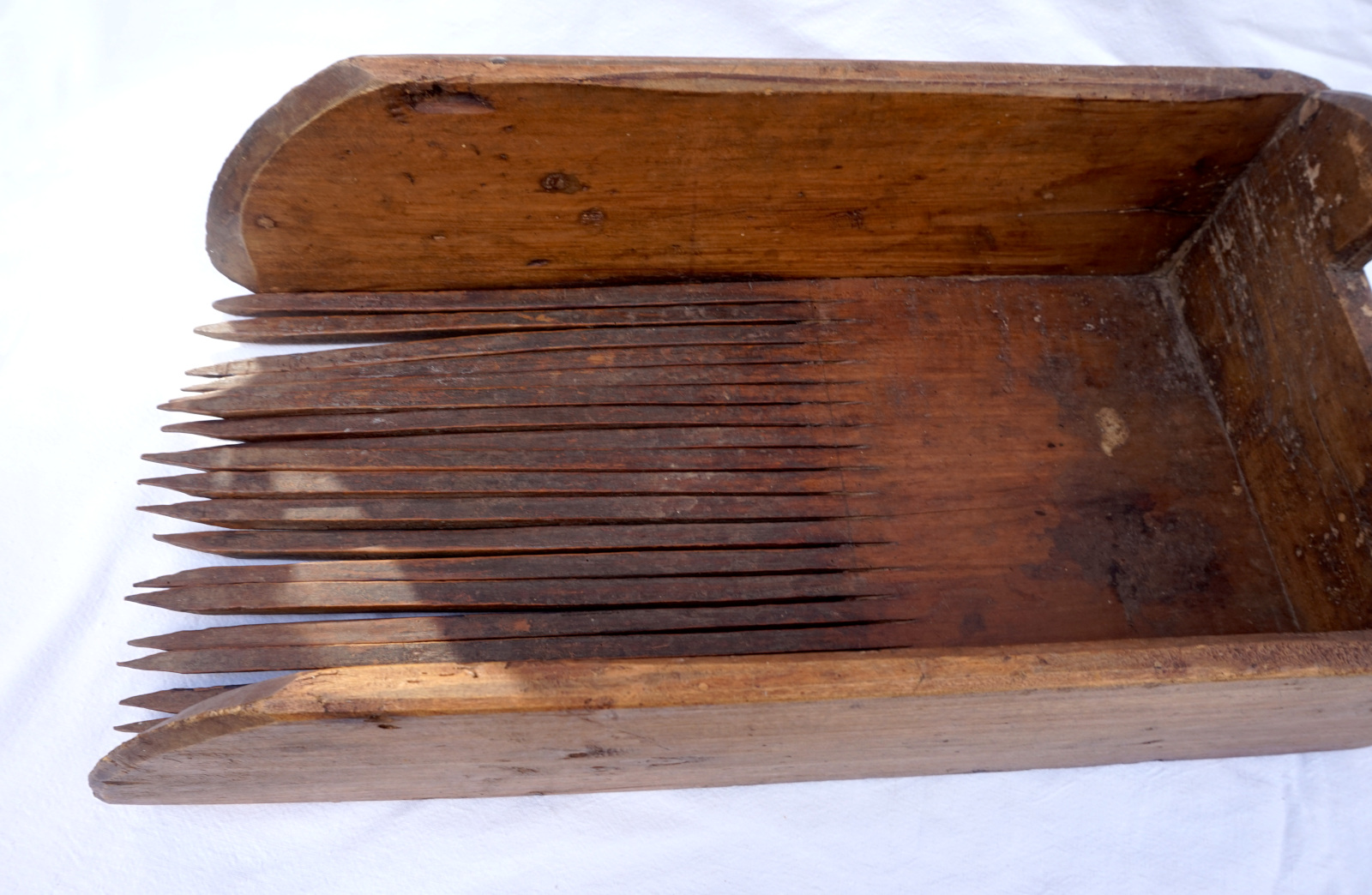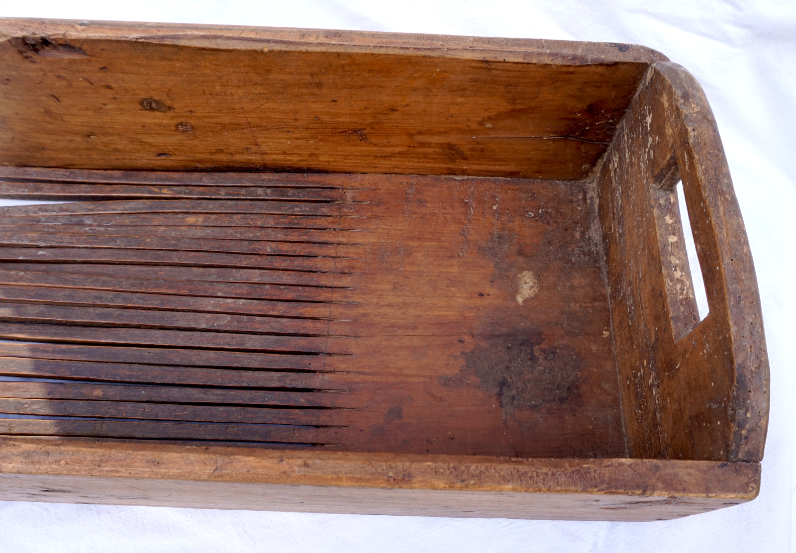 Antique french folk art large cranberry blueberry picker ,scoop with comb, in hard wood made late 19th century. 23" (58.5cm) length, 12" (30.5cm) width, 7" (18cm) height, weight 5lb 11oz (2.6kilograms). Good condition with beautiful patina, the wooden handle in front is missing.