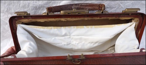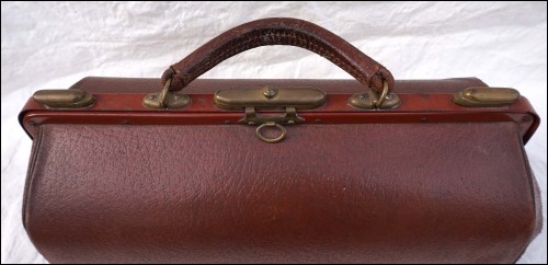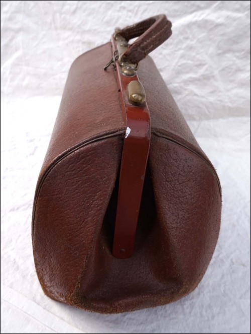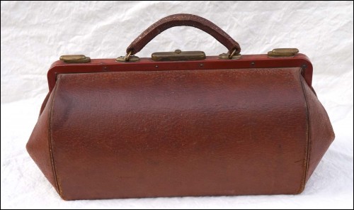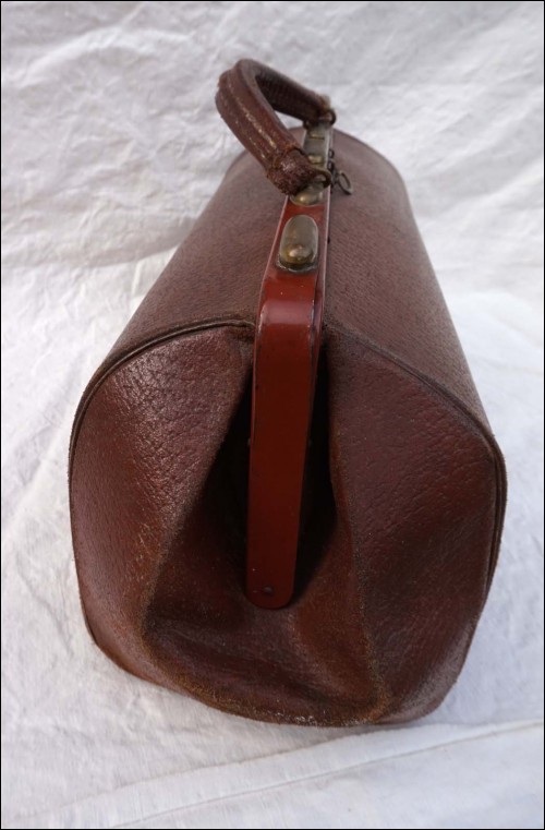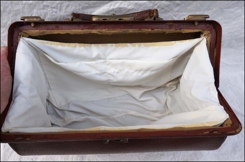 Sacoche de médecin en cuir à fermeture fer et laiton. Largeur 47 cm, hauteur avec l'anse 21 cm, profondeur 15,5 cm. Bel état d'usage la doublure est à revoir.