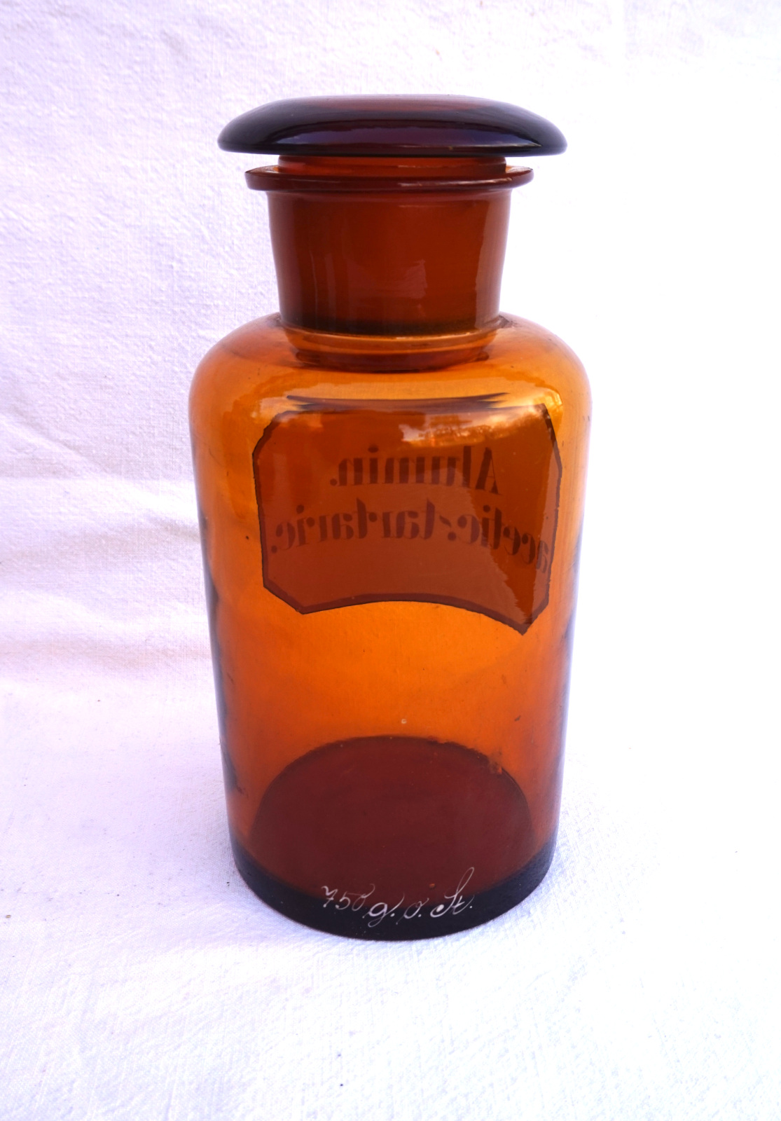 Large apothecary jar with stopper in amber glass with hand painted enamel label written Alumin. Acetic Tartaric ALSOL made late 19th century. 8 1/2" (21,5cm) height, 4" (10.2cm) diameter. Perfect condition.