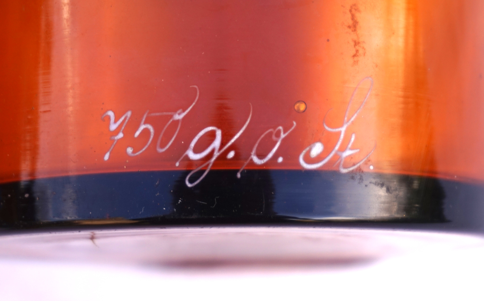 Pot à pharmacie en verre ambré avec un étiquette en émail peint à la main, fin XIX° siècle. Hauteur 21,5cm, diamètre 10.2cm. Très bel état.