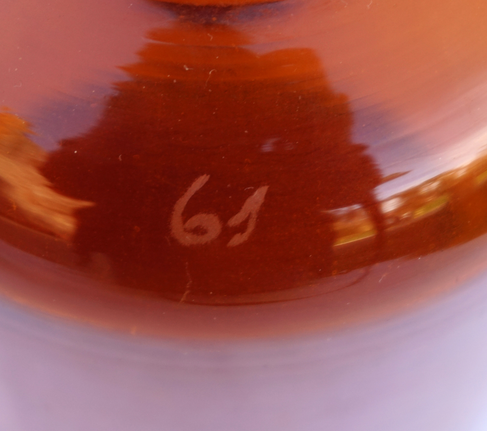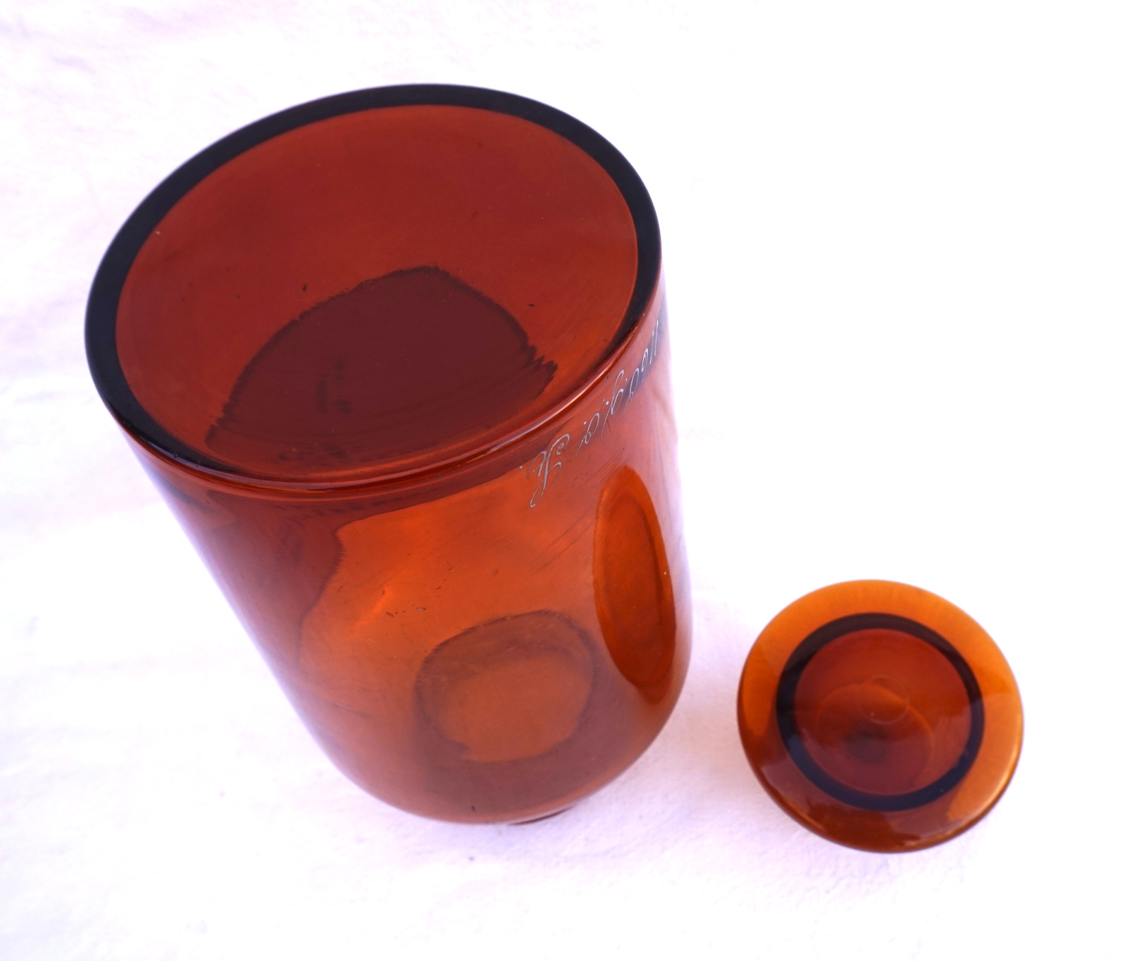 Pot à pharmacie en verre ambré avec un étiquette en émail peint à la main, fin XIX° siècle. Hauteur 25,5cm, diamètre 12,7cm.  Très bel état